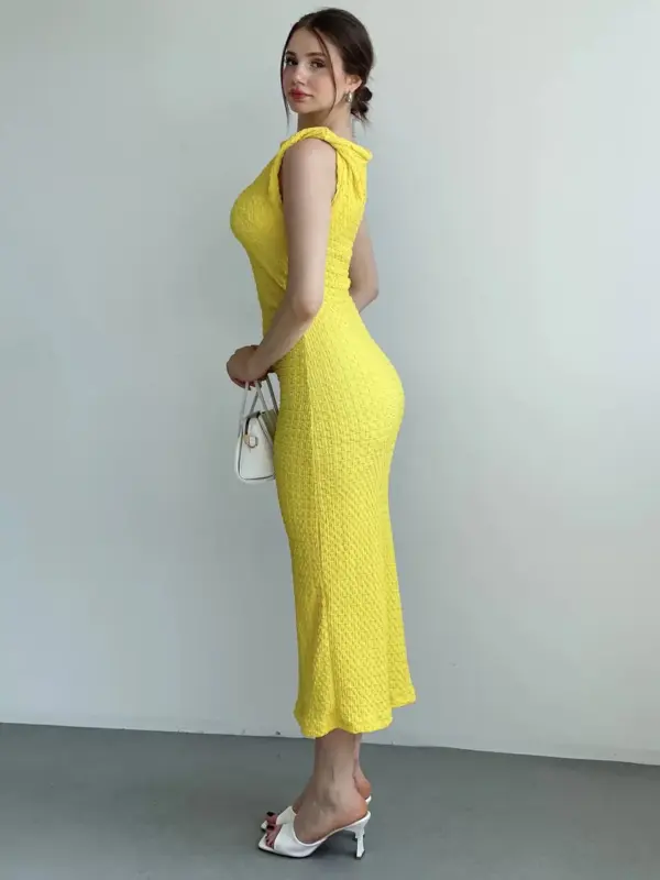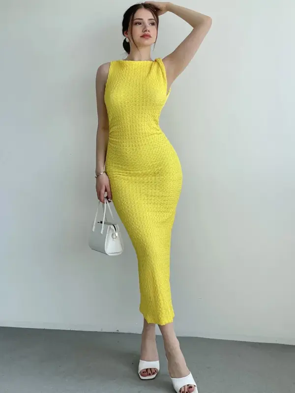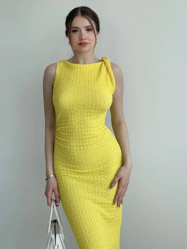 Ova elegantna haljina savršen je izbor za sve prilike kada želiš jednostavan, ali upečatljiv izgled! Rebrasta tekstura dodaje dinamiku silueti, dok kroj koji prati liniju tijela lijepo ističe figuru. Jednostavan gornji dio s detaljem čvora na ramenu donosi notu suptilne elegancije. Haljina je lagano providna i pruža udobnost zahvaljujući rastezljivom materijalu.