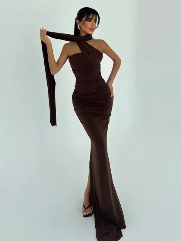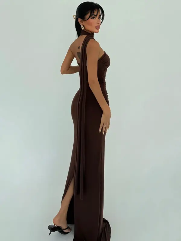 Ova svečana maxi haljina kombinuje udobnost i eleganciju, savršena za posebne prilike. Nabrani dio u struku omogućava prirodno prilagođavanje figuri, ističući siluetu na prefinjen način. Na dnu haljine nalazi se izrez, koji olakšava kretanje i dodaje dozu ležerne elegancije. Donji porub haljine nije obrađen.