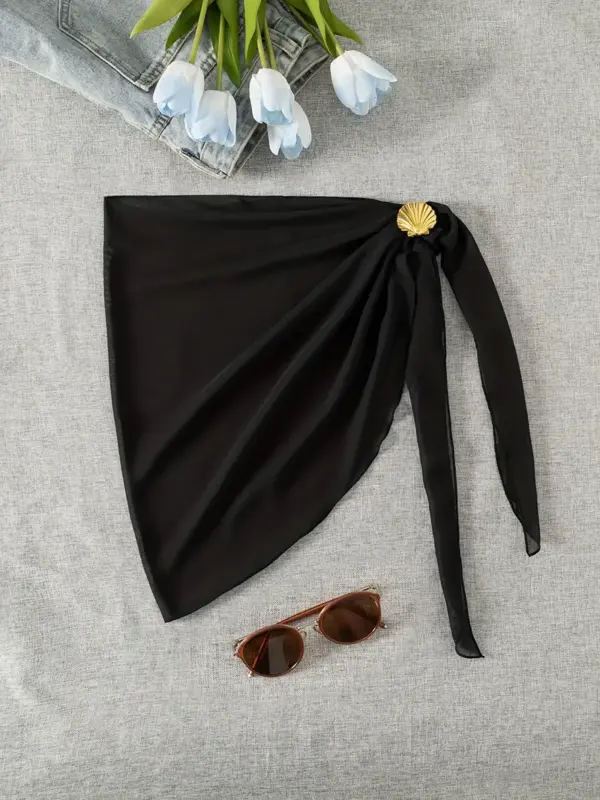 Istaknite svoj ljetni stil uz ovaj sofisticirani pareo idealan za plažu ili bazen! Prozirna i lagana tkanina nježno prati siluetu, dok zlatni detalj u obliku školjke na vezu daje prepoznatljiv morski šarm. Savršen je dodatak svakom kupaćem kostimu.