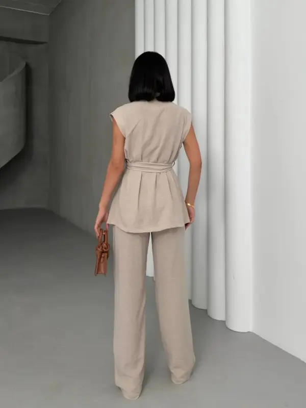 Ovaj sofisticirani set savršen je izbor za sve prilike kada želiš izgledati dotjerano i moderno uz minimalan trud. Gornji dio dolazi u formi prsluka sa širim reverima i vezanjem u struku koje ističe siluetu, dok su široke nogavice donjeg dijela idealne za udobnost i lepršav efekt.