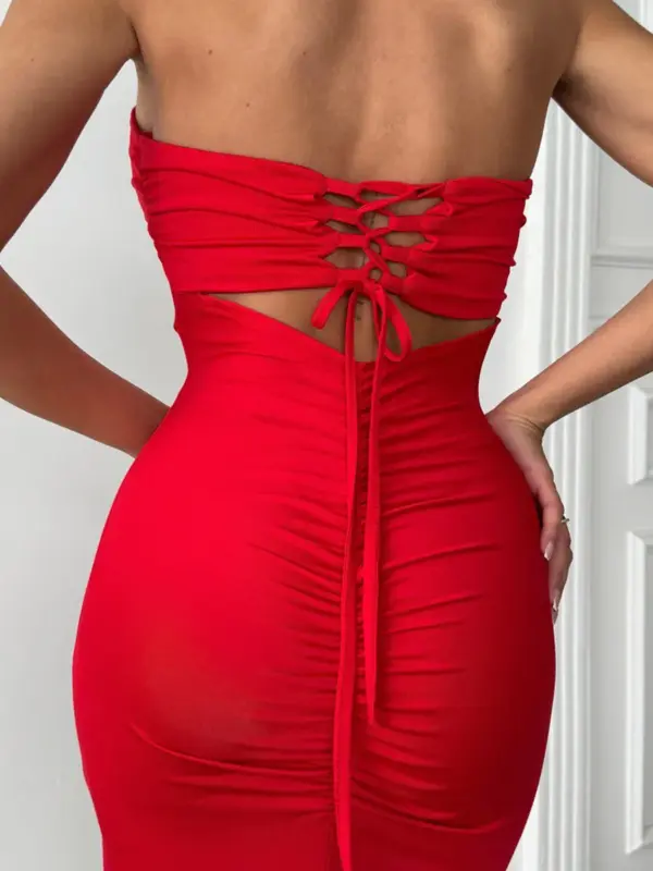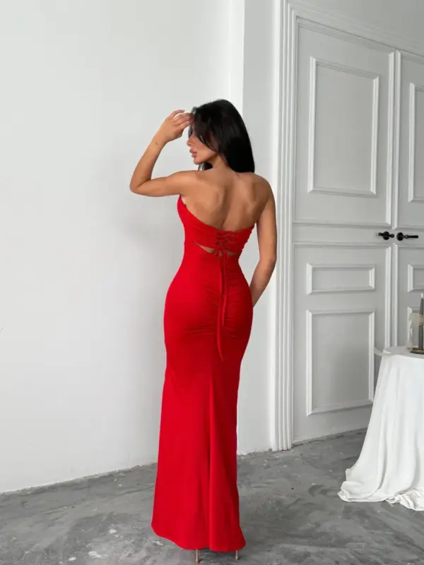 Elegantna i zavodljiva, ova crvena haljina savršena je za večernje izlaske, posebne prilike i sve trenutke kad želiš da zablistaš. Gornji dio je podstavljen radi bolje potpore, a efektnim vezanjem na leđima lako se prilagođava figuri.
