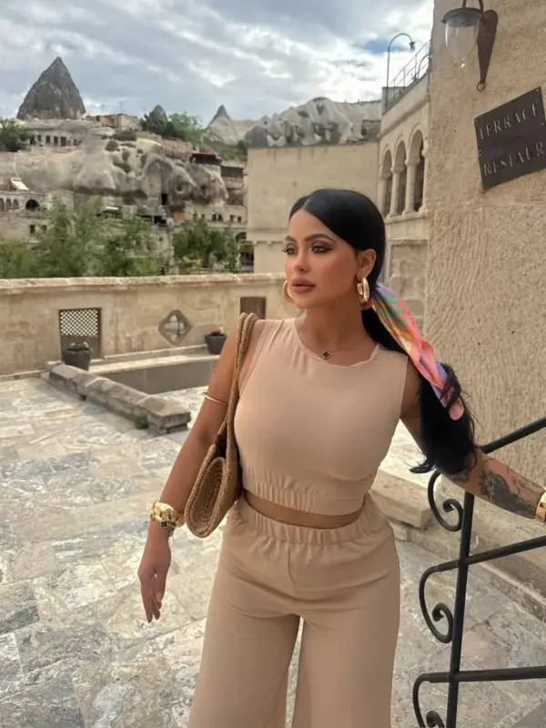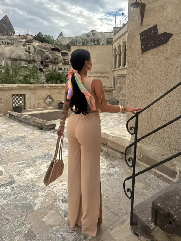 Dvodjelni komplet – set idealan za ležerne ljetne dane. Gornji dio je bez rukava i opuštenog kroja, dok su široke pantalone s visokim strukom izuzetno udobne za nošenje.