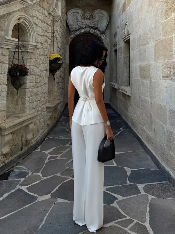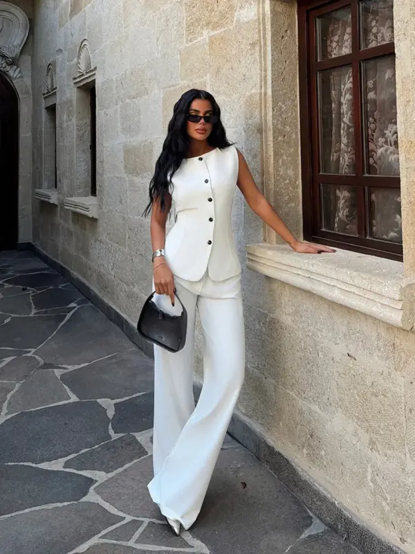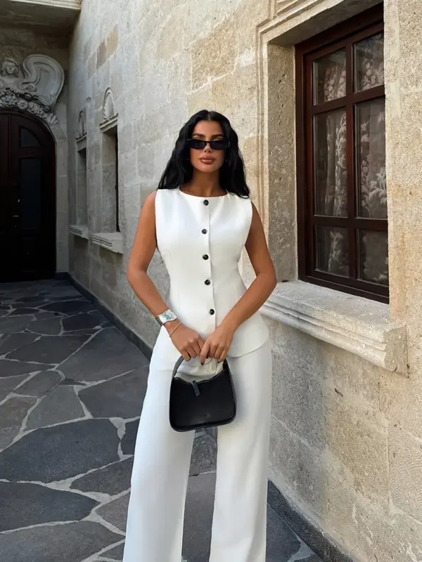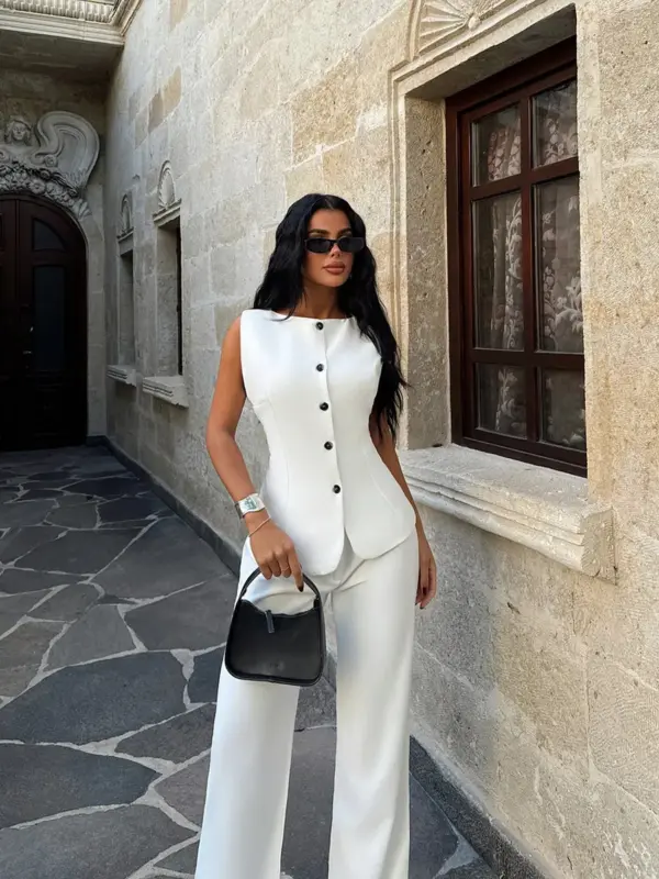 Ovaj bezvremenski set odiše ženstvenošću i klasom – idealan za poslovne sastanke, posebne događaje ili svečane prilike. Strukirani kroj gornjeg dijela s dugmićima ističe siluetu, dok široke pantalone pružaju dozu ležerne elegancije.