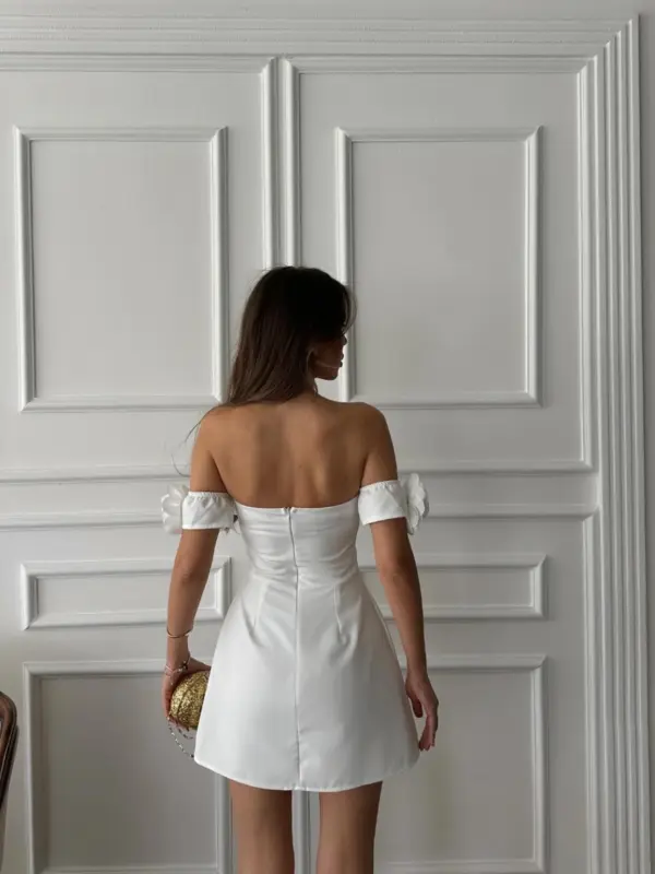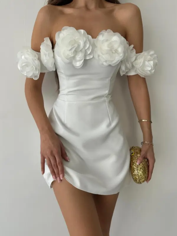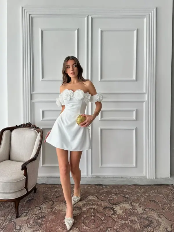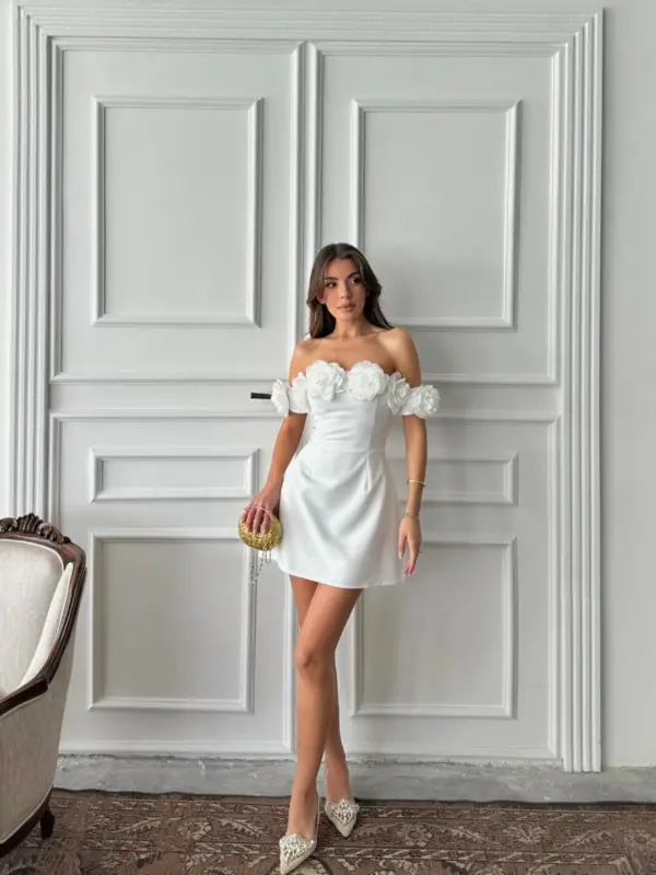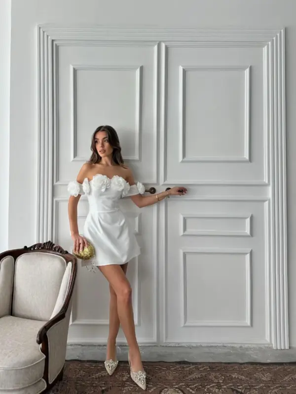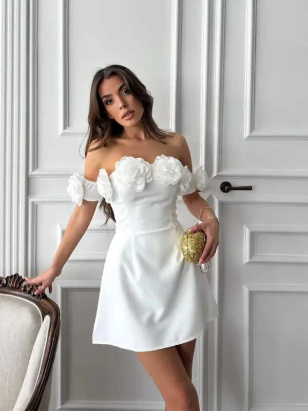 🔹 Gornji dio: Off-shoulder dizajn s voluminoznim cvjetnim aplikacijama i zatvaračem na leđima