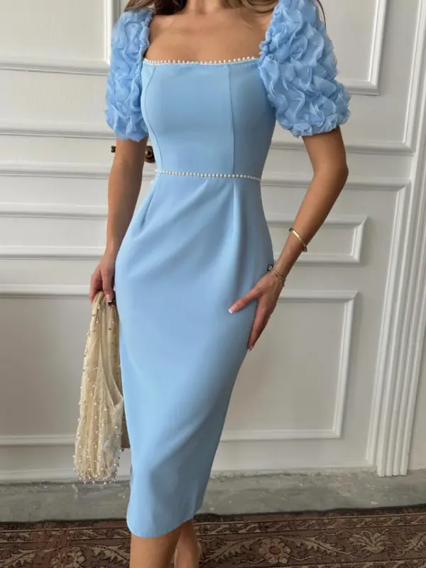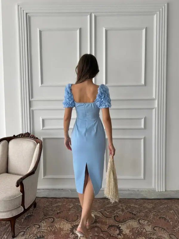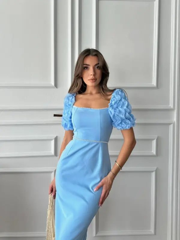 Romantični puf rukavi u 3D teksturi i biserna traka u struku čine ovu haljinu istinski posebnim komadom. Krojena tako da prati liniju tijela, s kvadratnim dekolteom i zadnjim prorezom za lakše kretanje, idealna je za svečane prilike, ljetne proslave i nezaboravne trenutke.
