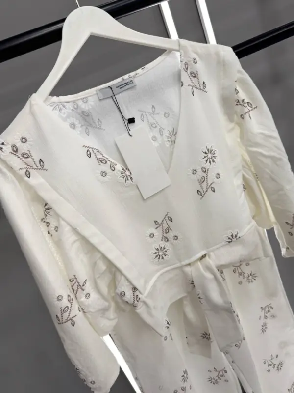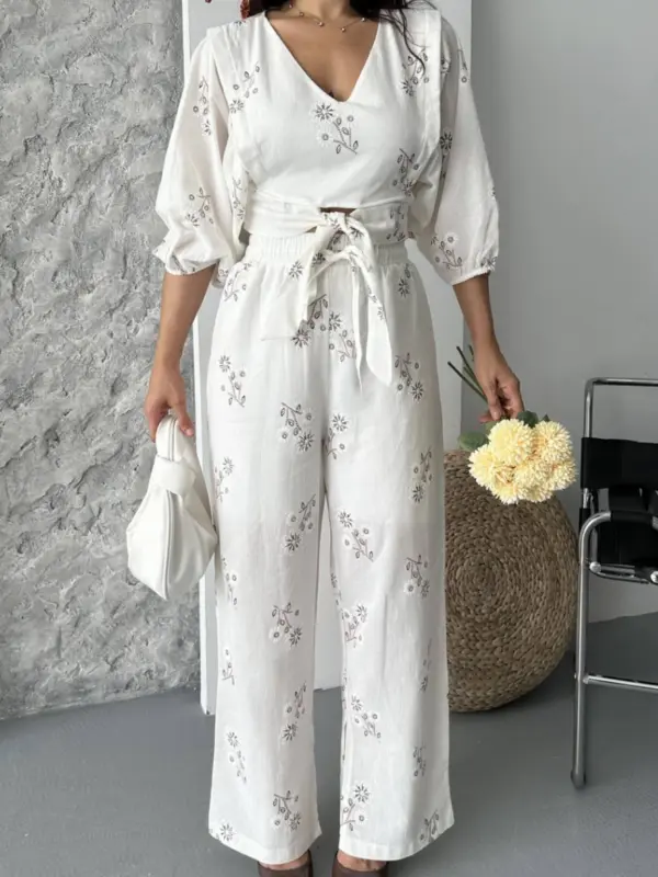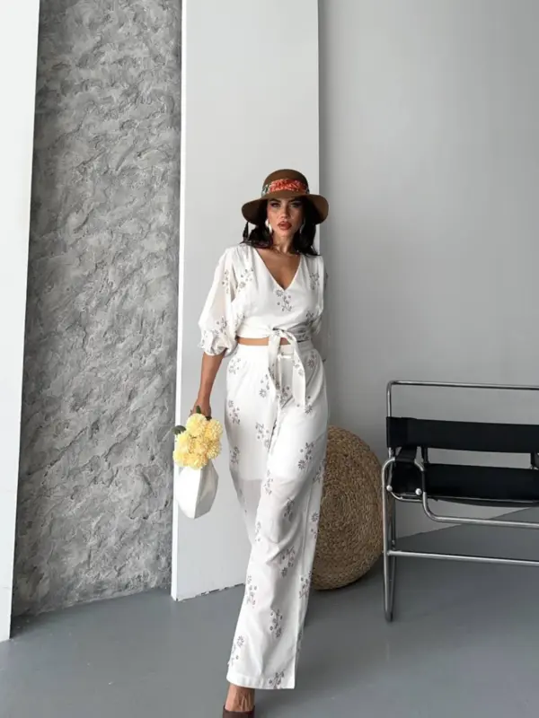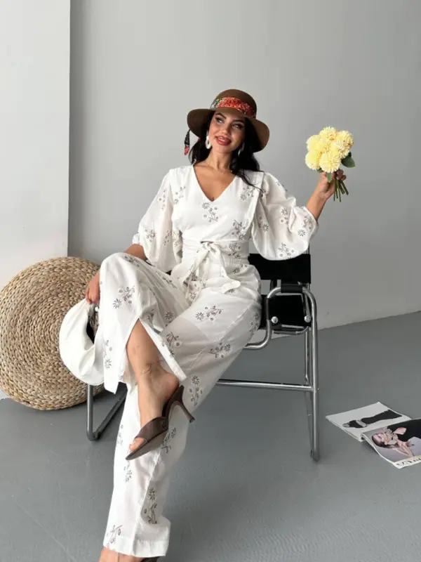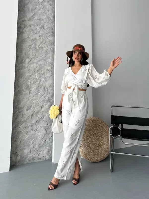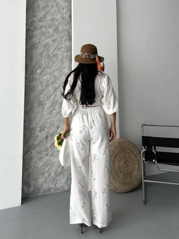 Ovaj ženstveni komplet kombinuje vintage šarm s modernom udobnošću – gornji dio s V-izrezom i vezivanjem u struku savršeno se uklapa uz široke pantalone koje pružaju slobodu pokreta. Cvjetni vez, lagana tkanina i pastelni tonovi čine ga savršenim za šetnje, piknike i putovanja.
