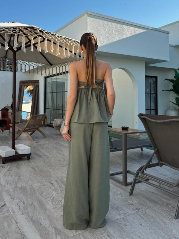Ovaj dvodjelni set spaja jednostavnost i ženstvenu udobnost u idealan ljetni outfit. Gornji dio je strapless kroja s vezivanjem na leđima, što omogućava prilagodbu obimu i stilu, dok blago nabrani kroj daje lepršav i opušten izgled. Pantalone dolaze s elastičnom gumom u struku i ravnim, širokim nogavicama koje pružaju maksimalnu udobnost i slobodu pokreta. Idealan izbor za tople dane, odmor, grad ili vikend izlete.