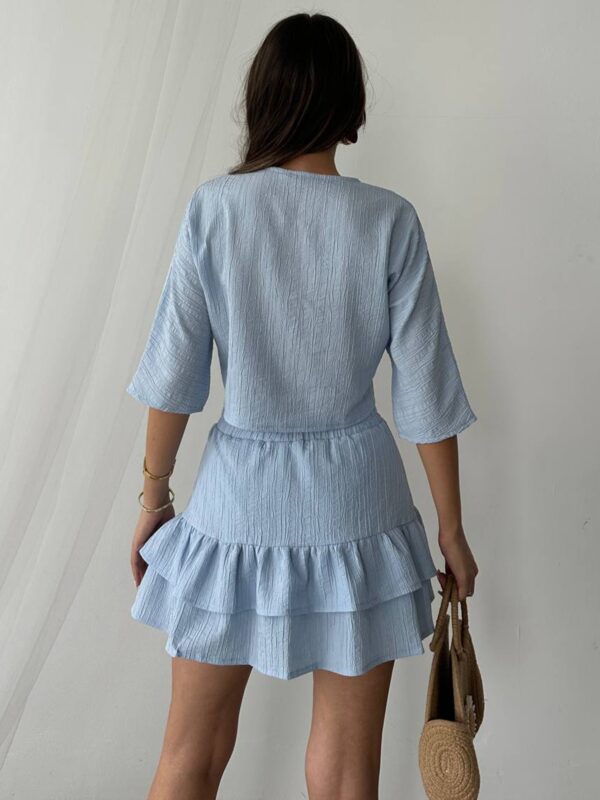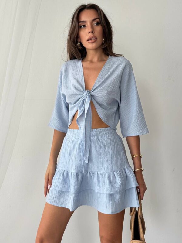 Set sa kratkom suknjom i vezivanjem spaja ženstveni kroj i udobnost idealnu za tople dane. Gornji dio je lagano oversized sa 3/4 rukavima i prednjim vezivanjem koje omogućava prilagodbu. Donji dio izgleda kao suknja, ali skriva praktičan šorc ispod, pružajući sigurnost pri svakom pokretu. Materijal je lagan, blago teksturiran i udoban za nošenje tokom cijelog dana. Guma u struku dodatno doprinosi komforu i lakoći oblačenja.
