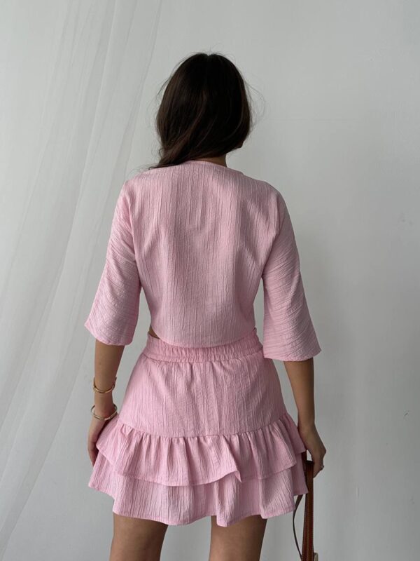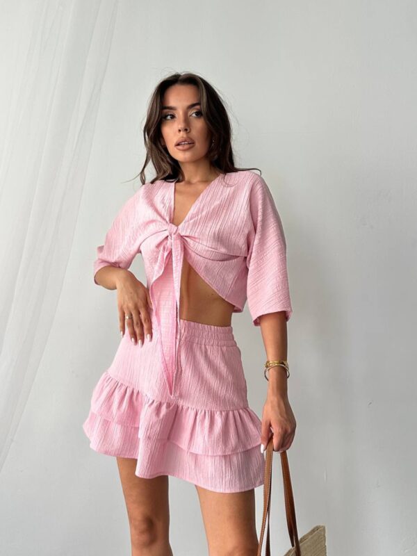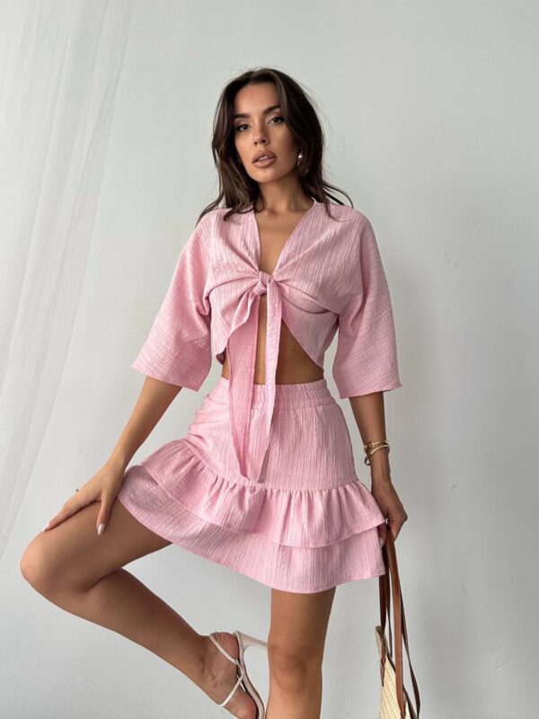 Set sa kratkom suknjom i vezivanjem spaja ženstveni kroj i udobnost idealnu za tople dane. Gornji dio je lagano oversized sa 3/4 rukavima i prednjim vezivanjem koje omogućava prilagodbu. Donji dio izgleda kao suknja, ali skriva praktičan šorc ispod, pružajući sigurnost pri svakom pokretu. Materijal je lagan, blago teksturiran i udoban za nošenje tokom cijelog dana. Guma u struku dodatno doprinosi komforu i lakoći oblačenja.