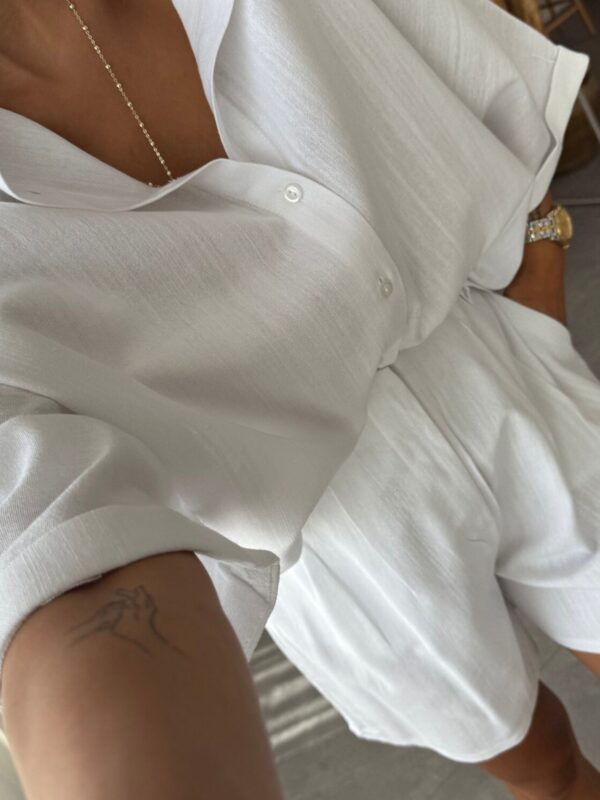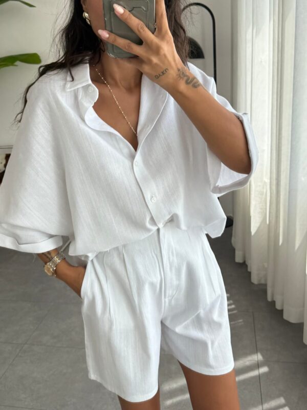 Ovaj dvodjelni set savršen je primjer ljetne opuštenosti i minimalizma. Gornji dio dolazi u oversized kroju sa spuštenim ramenima i klasičnim košulja dizajnom, što omogućava udobnost i stil u svakom pokretu. Donji dio su lagane, ravno krojene kratke hlače koji pruža prilagodljivost i lakoću nošenja. Ovaj komplet je savršen za tople dane, gradske šetnje ili opušteni brunch uz more.