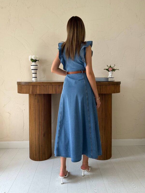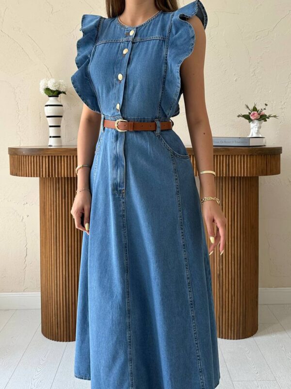 Ova ženstvena midi haljina spaja klasični kroj s romantičnim detaljima, stvarajući savršen balans između ležernog i sofisticiranog. Gornji dio bez rukava dodatno je naglašen volanima na ramenima, dok ukrasni dugmići duž cijele dužine dodaju vintage šarm. Haljina dolazi uz tanki kaiš koji se može nositi u struku za dodatno oblikovanje siluete. Izrađena je od udobnog materijala koji lijepo prati liniju tijela, a A-kroj suknje omogućava slobodno kretanje i elegantan pad. Model je manji i preporučuje se veća veličina za savršeno pristajanje.