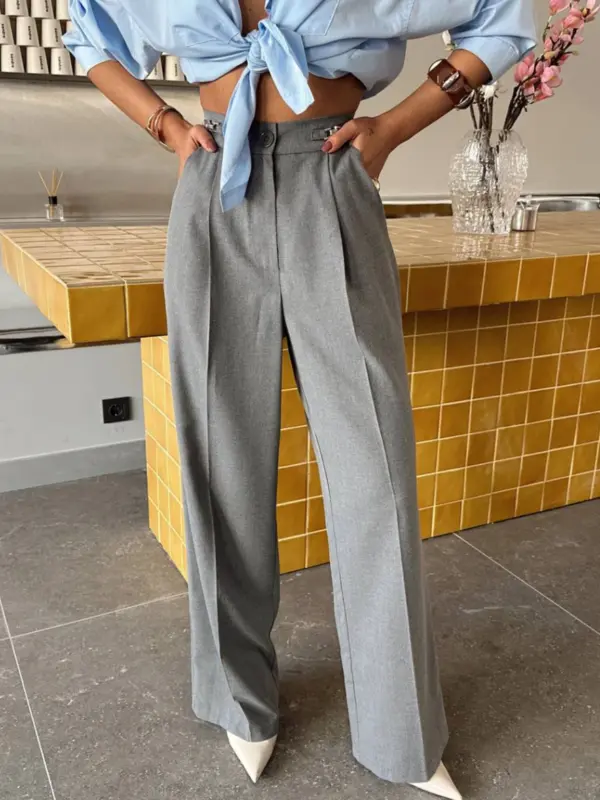 Široke Pantalone – hlace Visokog Struka s Metalnim Kopčama – Suptilna Poslovna Elegancija