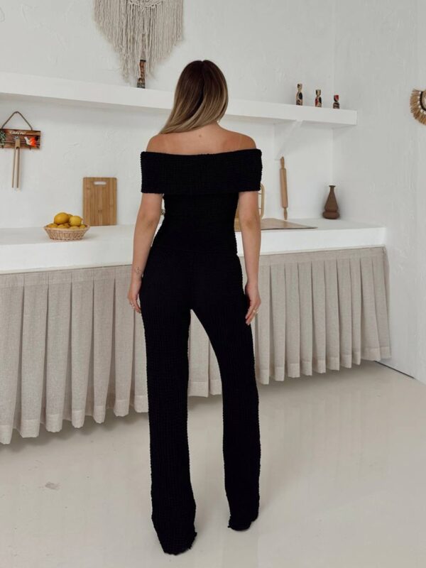 Ovaj dvodjelni set čine top s otkrivenim ramenima i široke pantalone, izrađeni od lagane, blago providne teksturirane tkanine koja diskretno prati liniju tijela. Gornji dio je naboran i nosi se tik ispod ramena, otkrivajući dekolte i stvarajući elegantnu bardot siluetu. Donji dio ističe se ravnim nogavicama koje daju izduženi, opušten izgled.