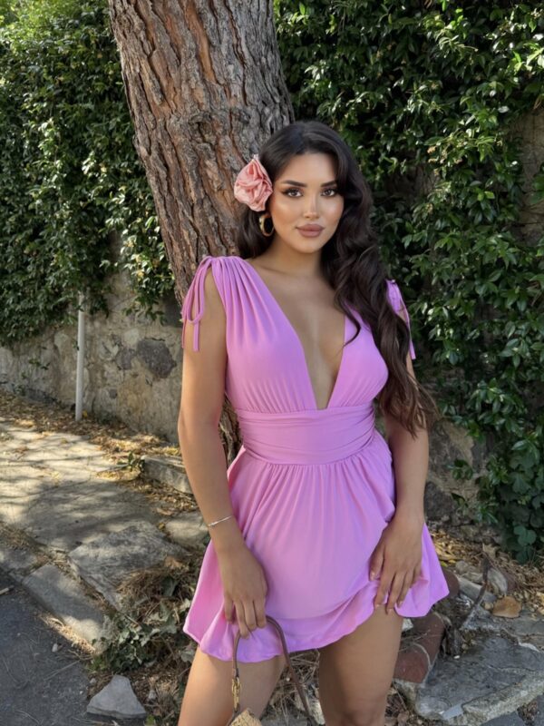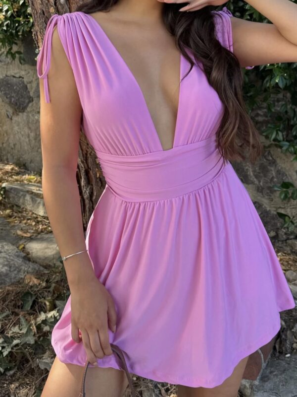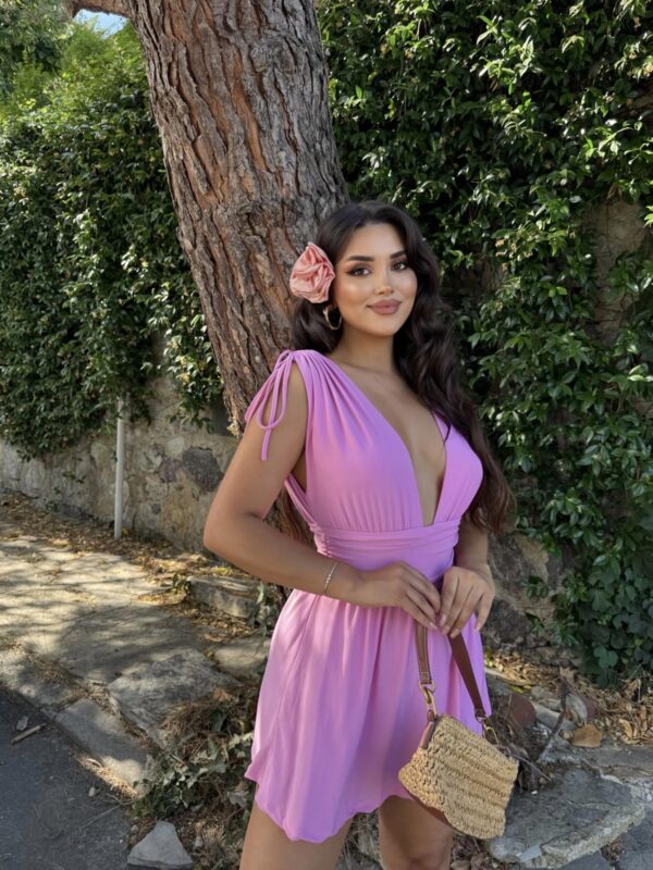 Ova romantična mini haljina je savršen izbor kada želite spojiti ženstvenost i udobnost! Duboki V-izrez i vezanje na ramenima daju joj poseban šarm, dok lepršavi donji dio skriva praktičan šorc ispod.