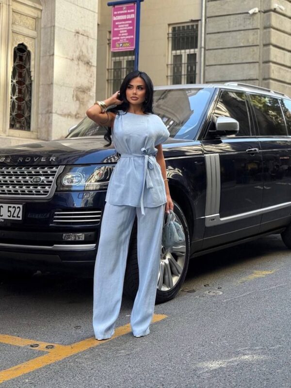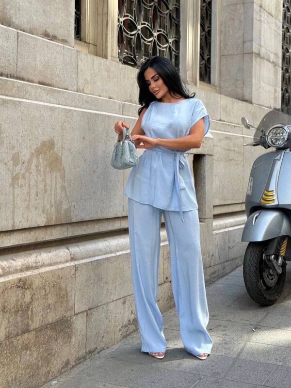 Elegantan, lagano prozračan komplet osmišljen za večernje izlaske i dnevne prilike. Gornji dio je tunika s suptilnim naborima na ramenima i asimetričnim izrezom koji se blago steže u struku uz pomoć širokog tie-detalja.