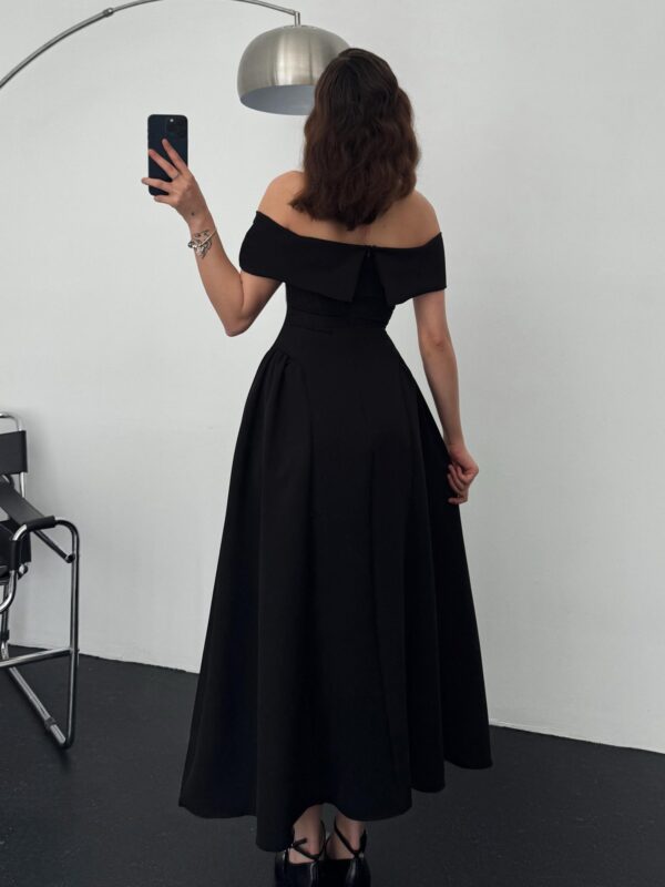 Elegantna off‑shoulder midi haljina s lepezastom suknjom