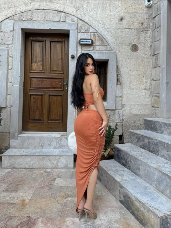 Uska udobna haljina sa elastinom, prorezima sa strane i izrezom, i zlatnim detaljem na ramenu. Donji dio je podstavljen, preporučujemo da oblačite neutralne boje ispod.