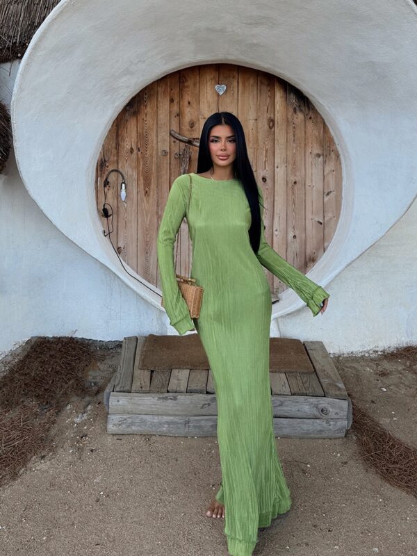 Plisirana haljina. Tkanina je blago providna, uz ovu boju ne dođe podstava, potrebno obući podhaljinu ispod.
