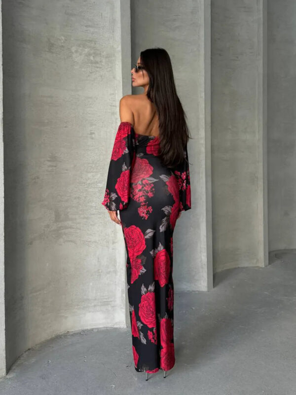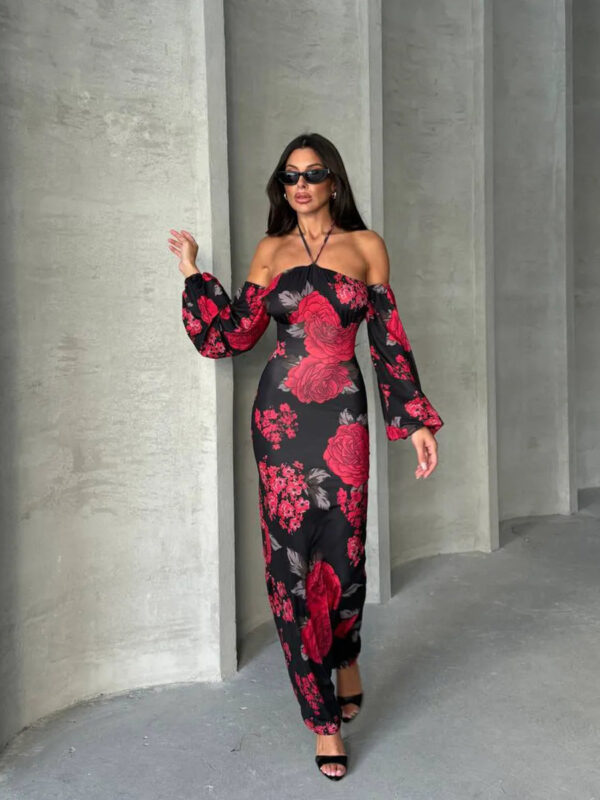 Midi haljina s printom ruža. Haljina je rastezljiva i prilagođava se obliku tijela, s presjekom ispod grudi za isticanje figure. Gornji porub i rukavi imaju lastiku koja omogućava prilagodbu prema željenoj poziciji. Haljina nema izreze i može biti blago providna. Upute za pranje: prati na 30°C, ne sušiti u sušilici, peglati s tkaninom preko ili parom.