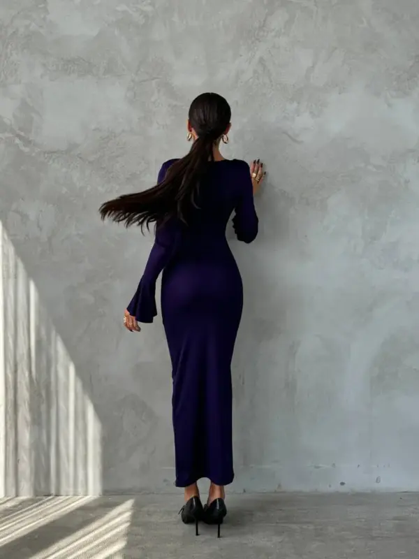 Midi haljina s prorezom na struku i zvonastim rukavima. Haljina je elastična i ima metalni detalj koji treba skinuti prije pranja. Na ramenima su ubačene spužvice za dodatnu podršku. Ovaj model savršeno naglašava figuru i nudi kombinaciju elegancije i udobnosti, idealan za razne svečane prilike. Preporučuje se pranje na 30°C, bez sušenja u sušilici, te peglanje s tkaninom preko ili parom.