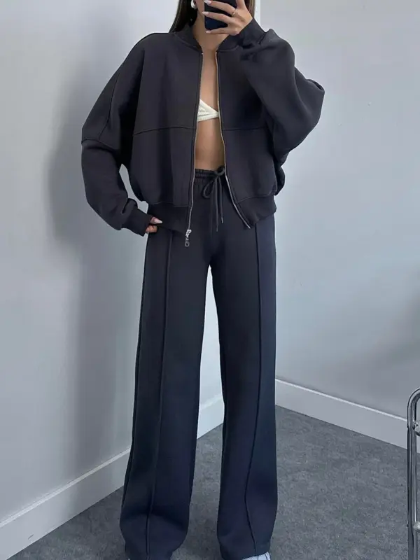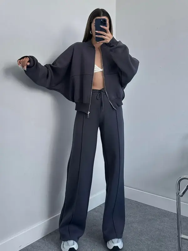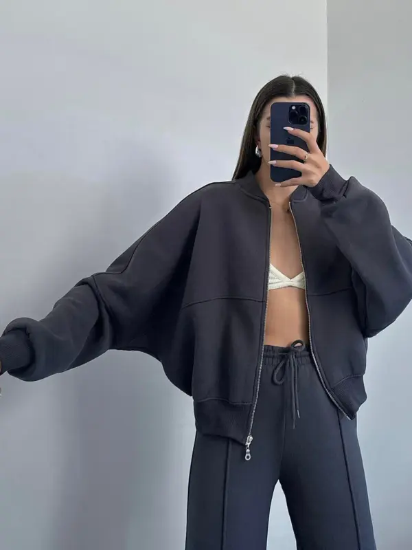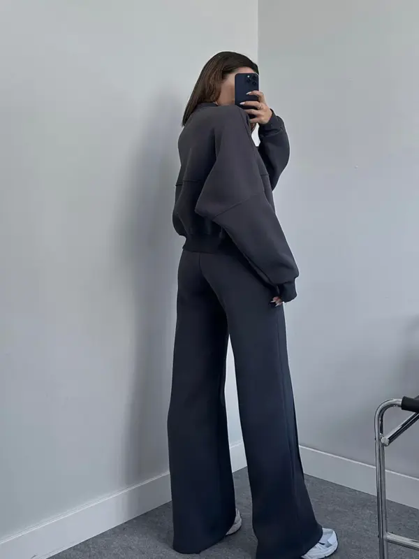 Ova dvodjelna termo trenerka sastoji se od gornjeg dijela – duksa sa zatvaračem (zipperom) u oversize kroju, koji pruža opušten i udoban izgled. Donji dio ima široke nogavice, sa dodatnom udobnošću zahvaljujući elastičnoj gumi u struku koja omogućava lako prilagođavanje. Unutrašnjost trenerke je obložena mekim materijalom, pružajući dodatnu toplinu i udobnost. Idealna je za opuštene dnevne kombinacije ili lagane sportske aktivnosti.