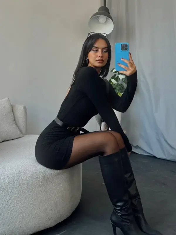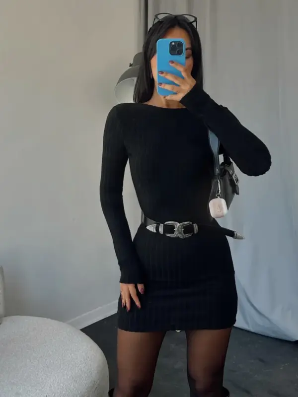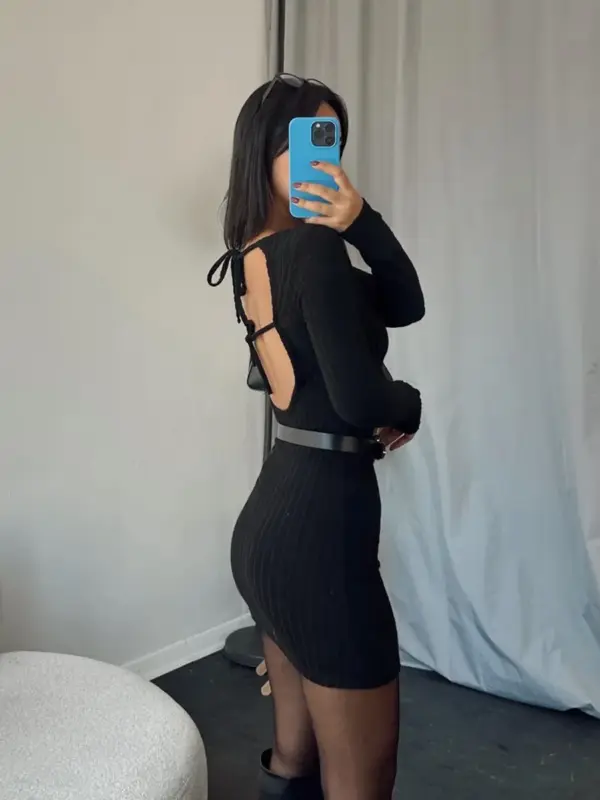 Mini rebrasta haljina sa otvorenim leđima. Jako kratka – preporučujemo pogledajte dimenzije prije kupovine. Kaiš ne dože uz haljinu.