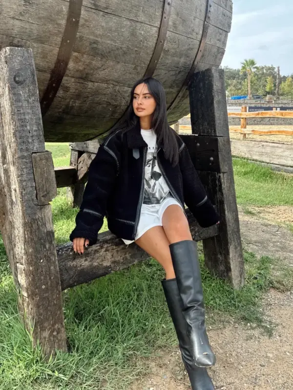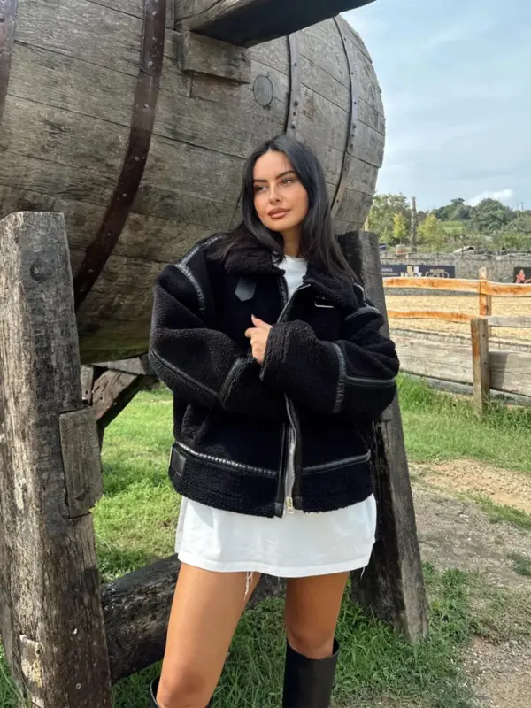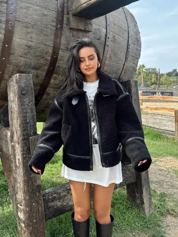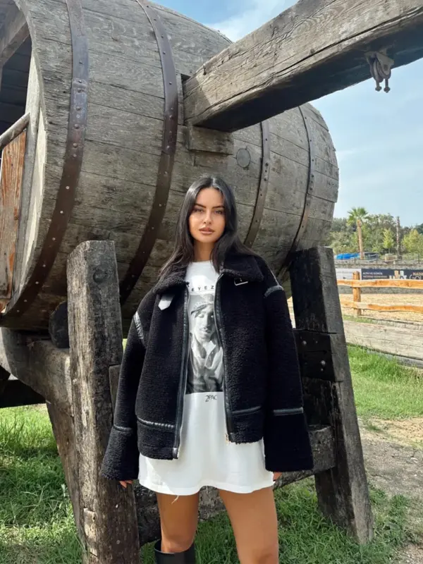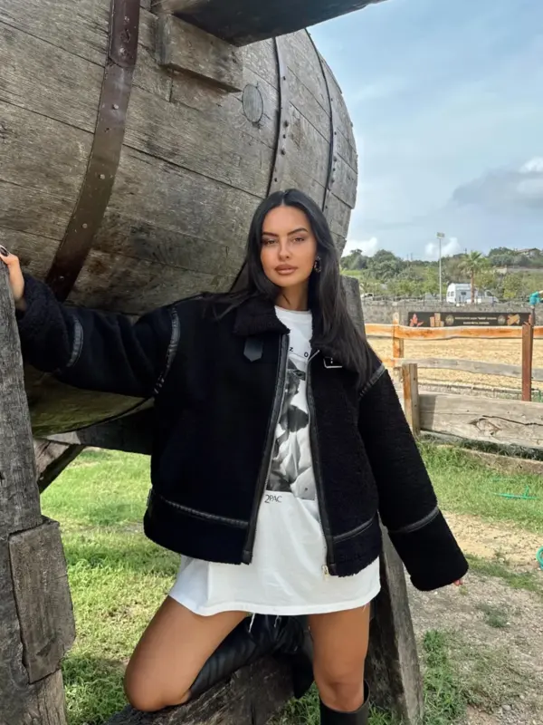 Jakna s ovratnikom. Podstava od umjetnog janjećeg runa. Preklop s patentnim zatvaračem.