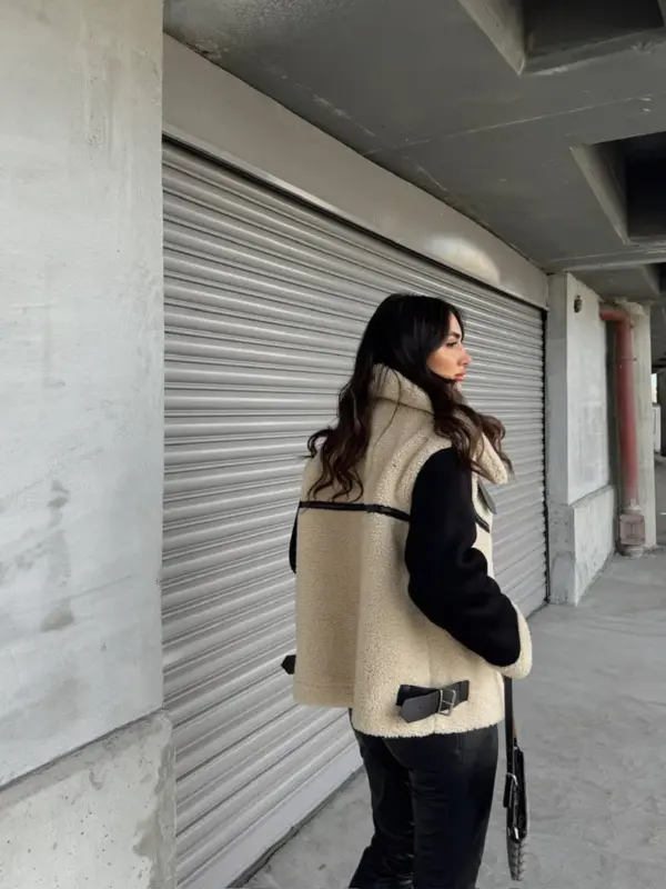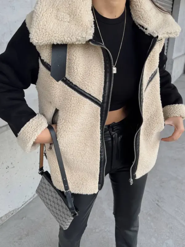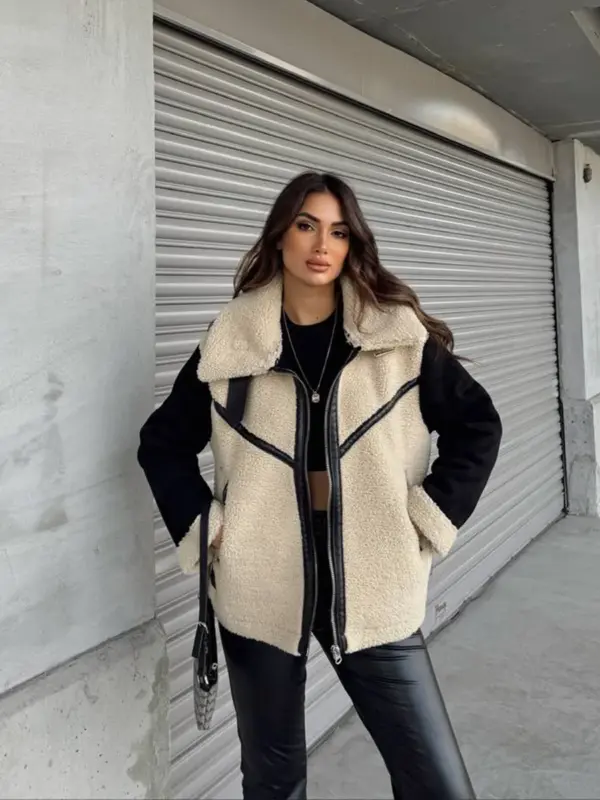 Kontrastna jakna s ovratnikom. Podstava od umjetnog janjećeg runa. Prednji džepovi s patentnim zatvaračima. Preklop s patentnim zatvaračem.
