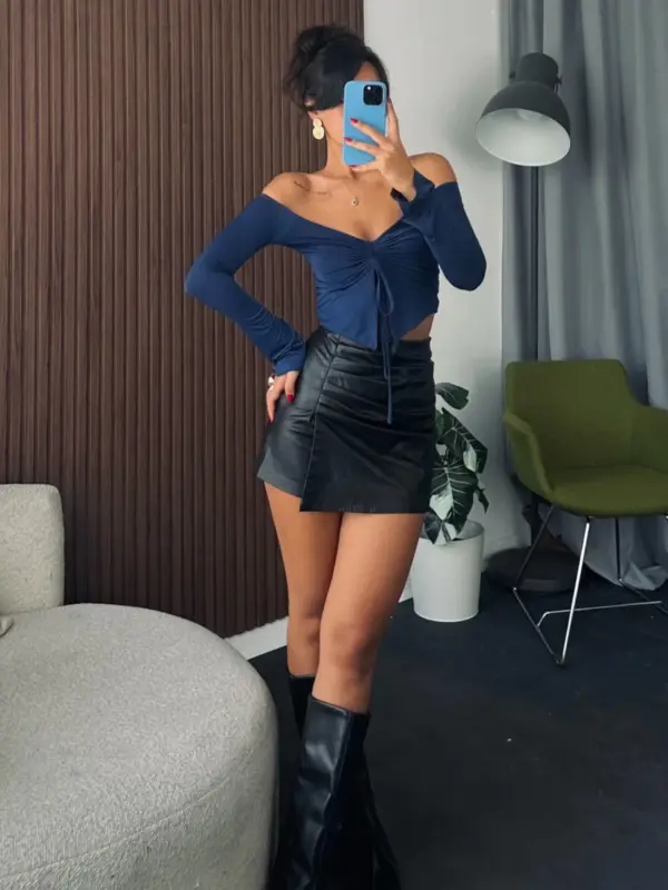 Crop majica sa šiljastim rubovima i prorezom po sredini, dizajnirana s naborom u predjelu grudi za naglašavanje figure. Majica ima spuštena ramena, što dodaje opušten, ali zavodljiv izgled, savršena za moderne i upečatljive kombinacije. Blago providna
