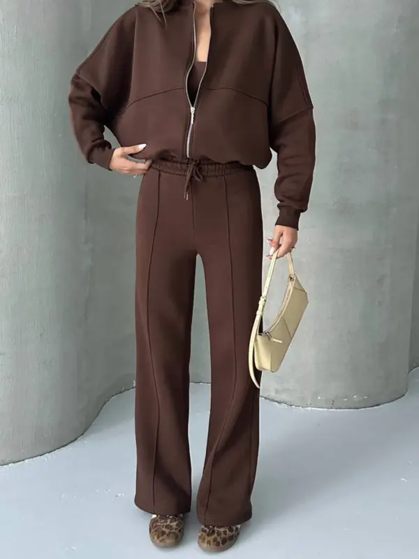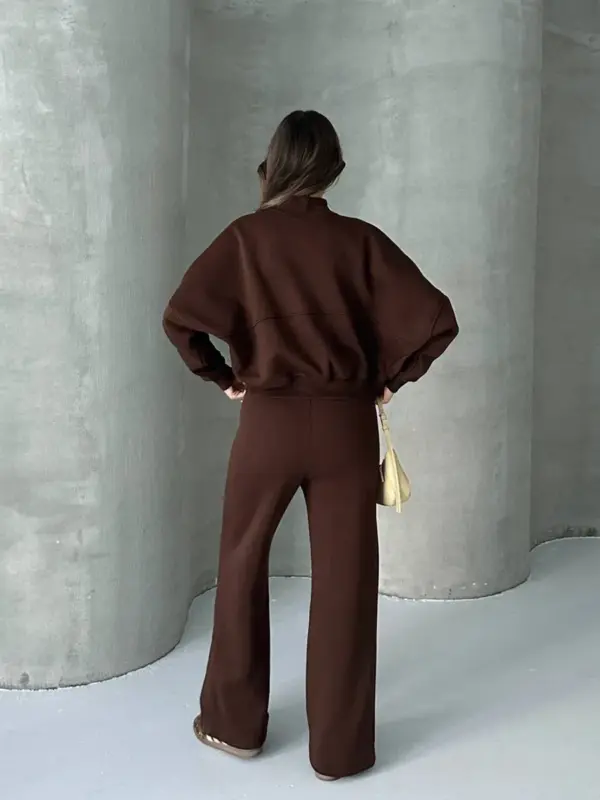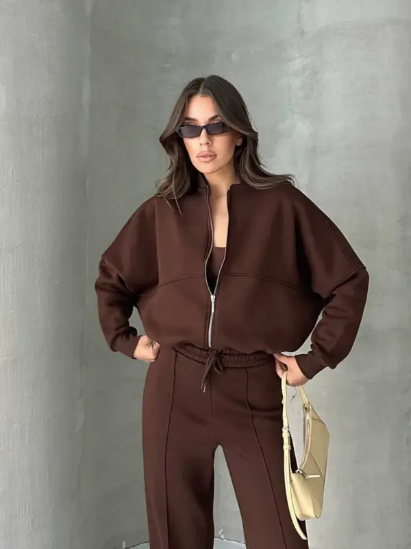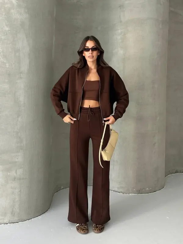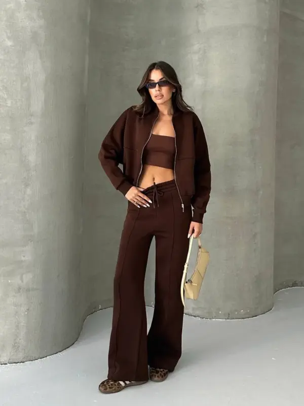 Ova dvodijelna trenerka sastoji se od gornjeg dijela – duksa sa zatvaračem (zipperom) u oversize kroju, koji pruža opušten i udoban izgled. Donji dio ima široke nogavice, sa dodatnom udobnošću zahvaljujući elastičnoj gumi u struku koja omogućava lako prilagođavanje. Unutrašnjost trenerke je obložena mekim materijalom, pružajući dodatnu toplinu i udobnost. Idealna je za opuštene dnevne kombinacije ili lagane sportske aktivnosti.