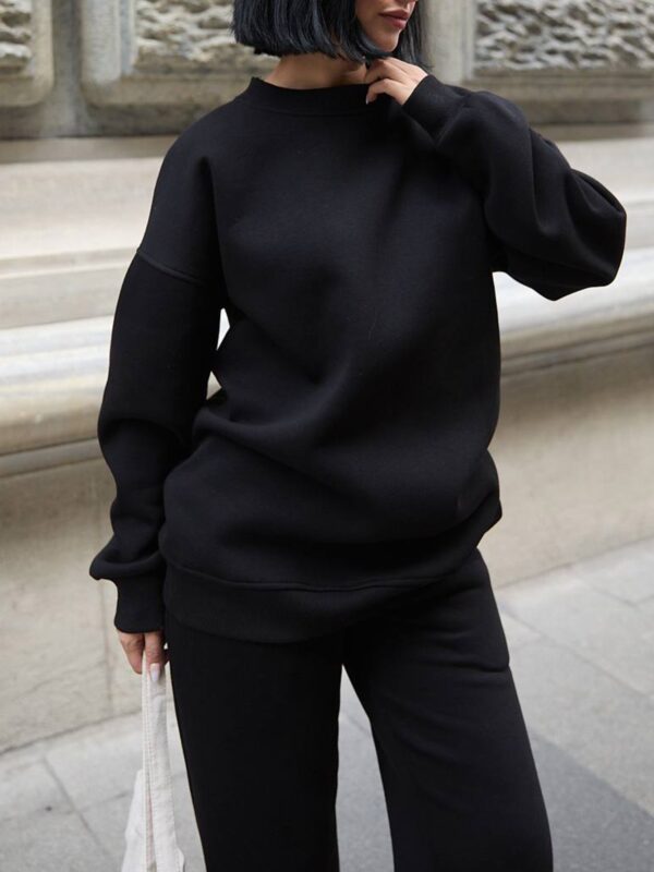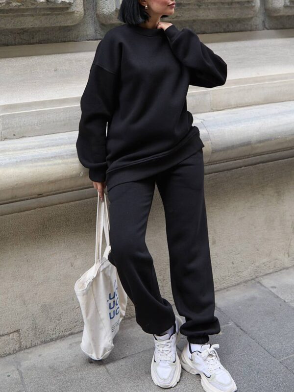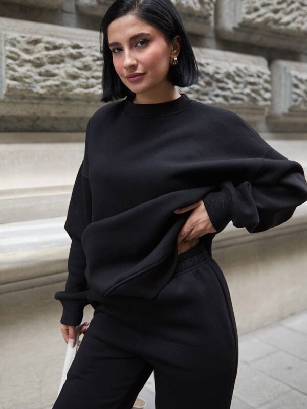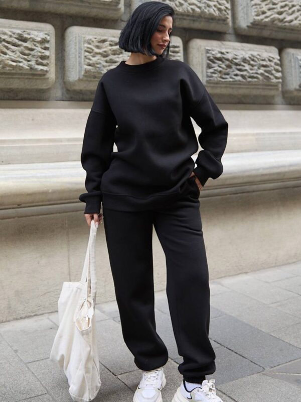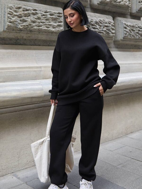 Set čine klasična dukserica i trenerka sa elastičnim strukom. Kroj je opušten i udoban, a unutrašnjost obložena termo materijalom koji pruža prijatan osjećaj topline.