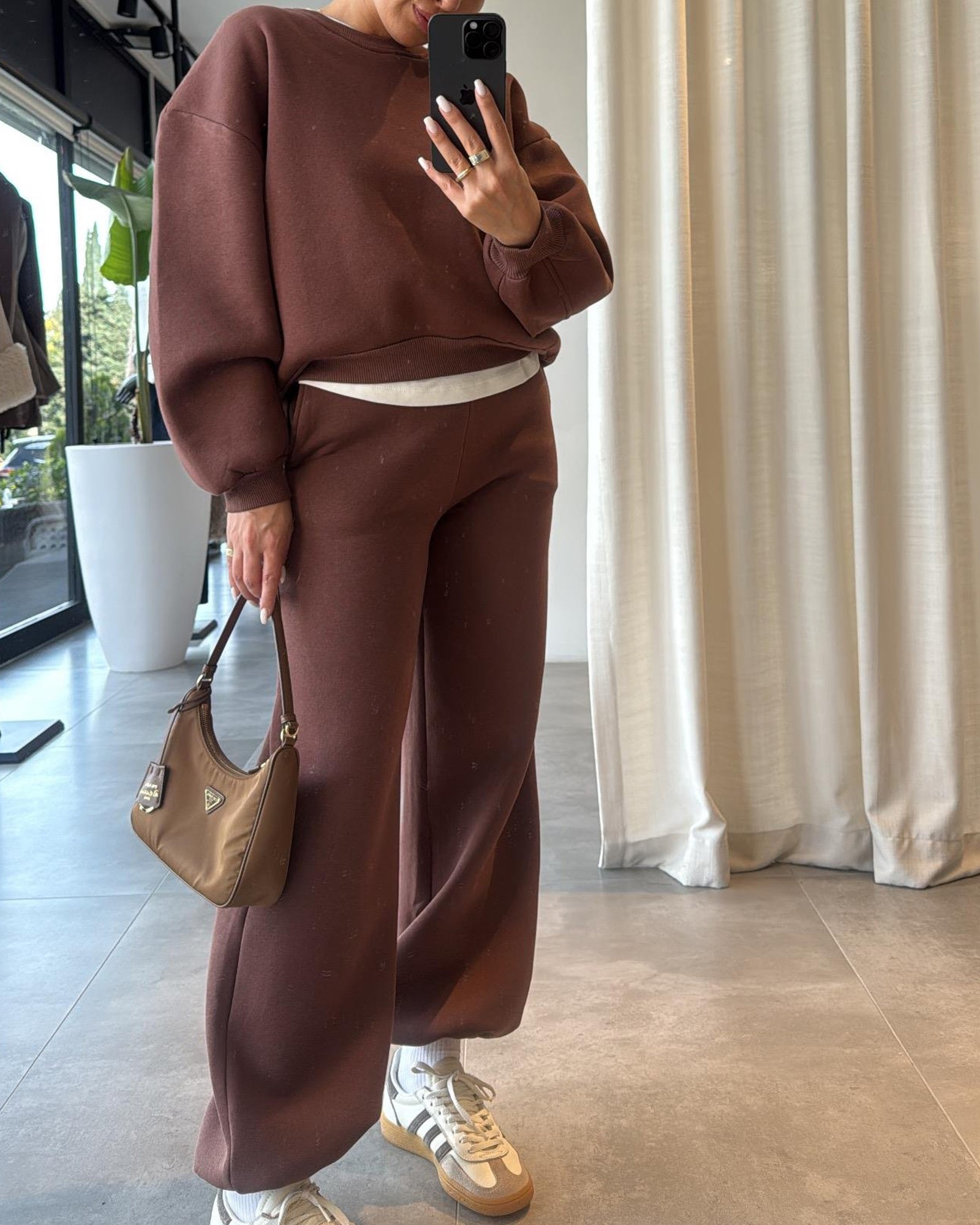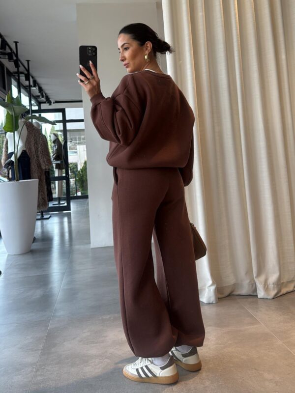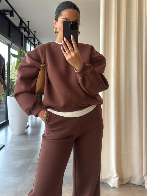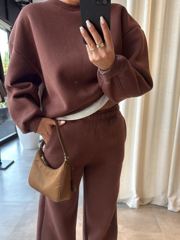 Set čine klasična dukserica i trenerka sa elastičnim strukom. Kroj je opušten i udoban, a unutrašnjost obložena termo materijalom koji pruža prijatan osjećaj topline.