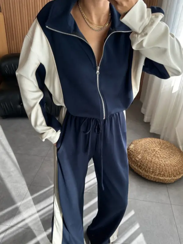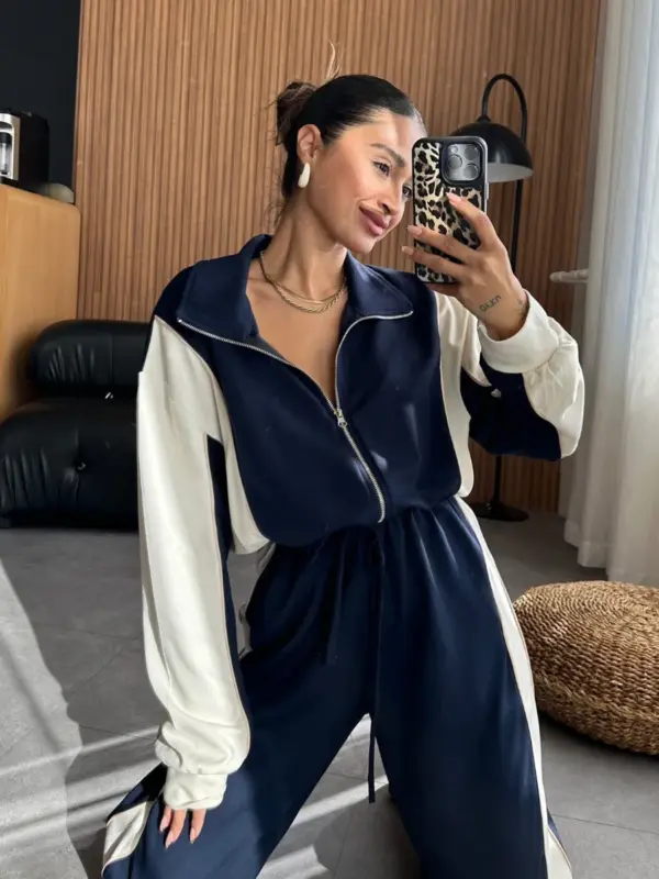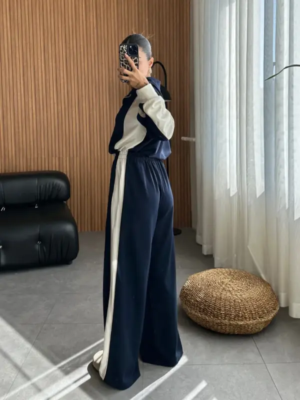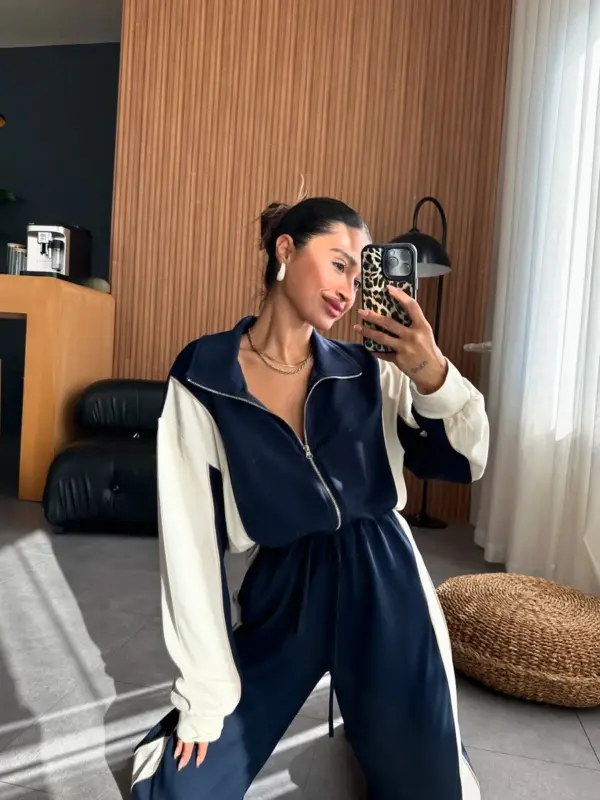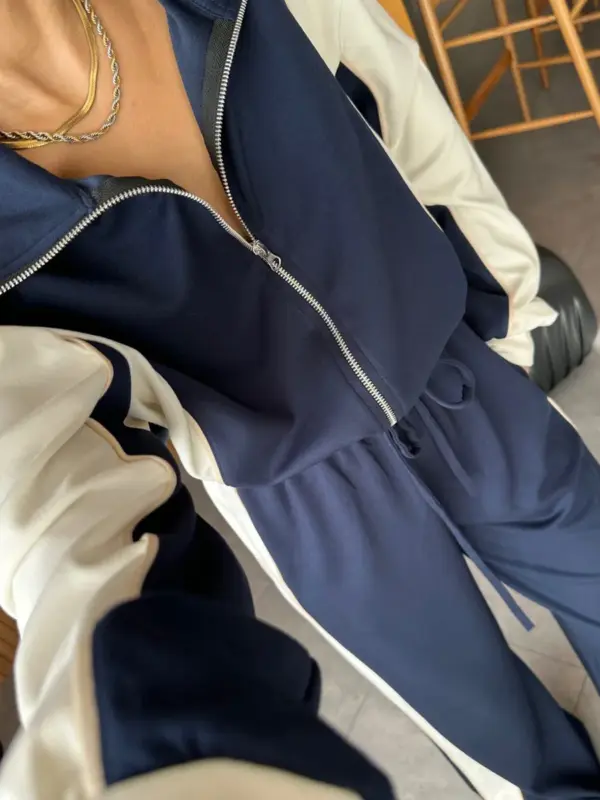 Ova dvodijelna kontrastna trenerka sastoji se od gornjeg dijela – duksa sa zatvaračem (zipperom) u oversize kroju, koji pruža opušten i udoban izgled. Donji dio ima široke nogavice, sa dodatnom udobnošću zahvaljujući elastičnoj gumi u struku koja omogućava lako prilagođavanje. Idealna je za opuštene dnevne kombinacije ili lagane sportske aktivnosti.