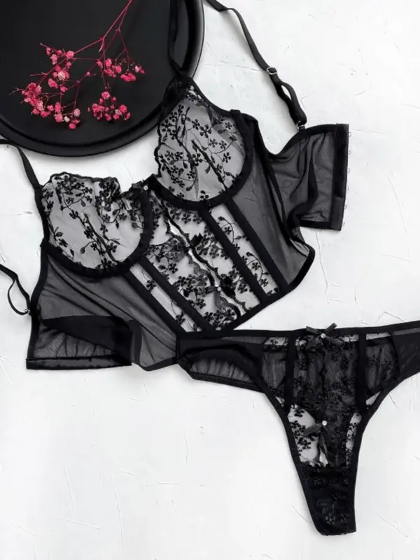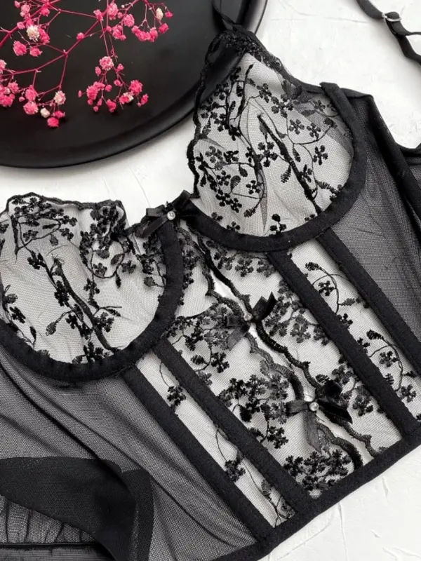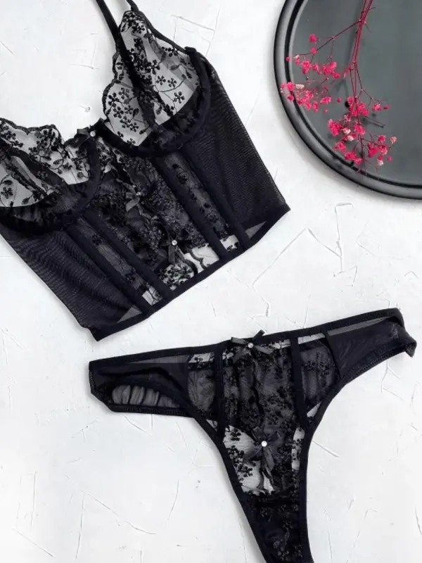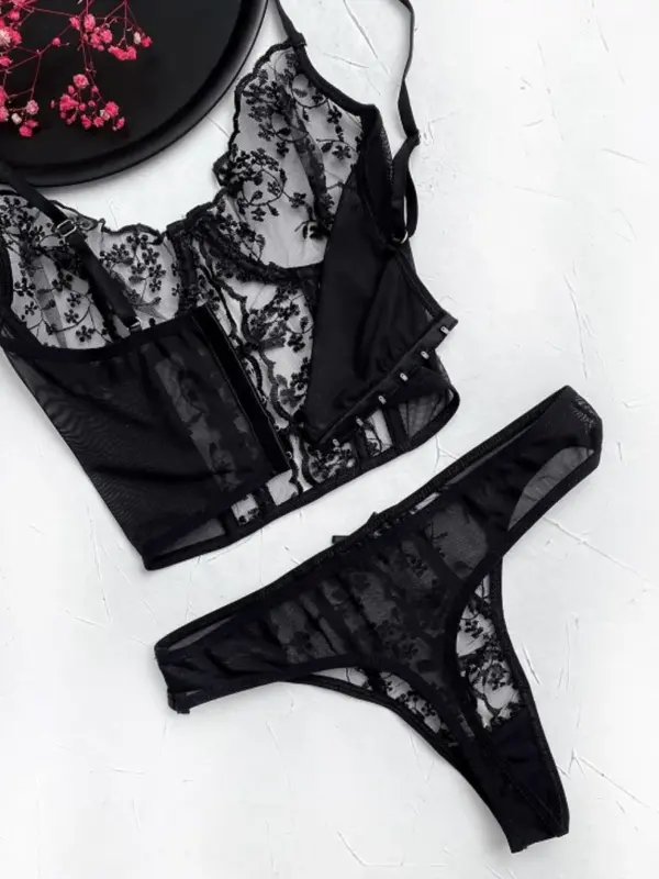 Dvodjelni lingerie bustier set u kombinaciji mrežice i veza s podesivim naramenicama na gornjem dijelu. Gornji dio se nazad veže. Donji dio brazilke. Upute za održavanje: pranje na 30°C ili ručno, ne sušiti u sušilici, ne peglati.