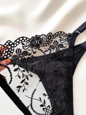Dvodjelni lingerie bustier set u kombinaciji mrežice i veza s podesivim naramenicama na gornjem dijelu. Gornji dio se nazad veže. Donji dio brazilke. Upute za održavanje: pranje na 30°C ili ručno, ne sušiti u sušilici, ne peglati.