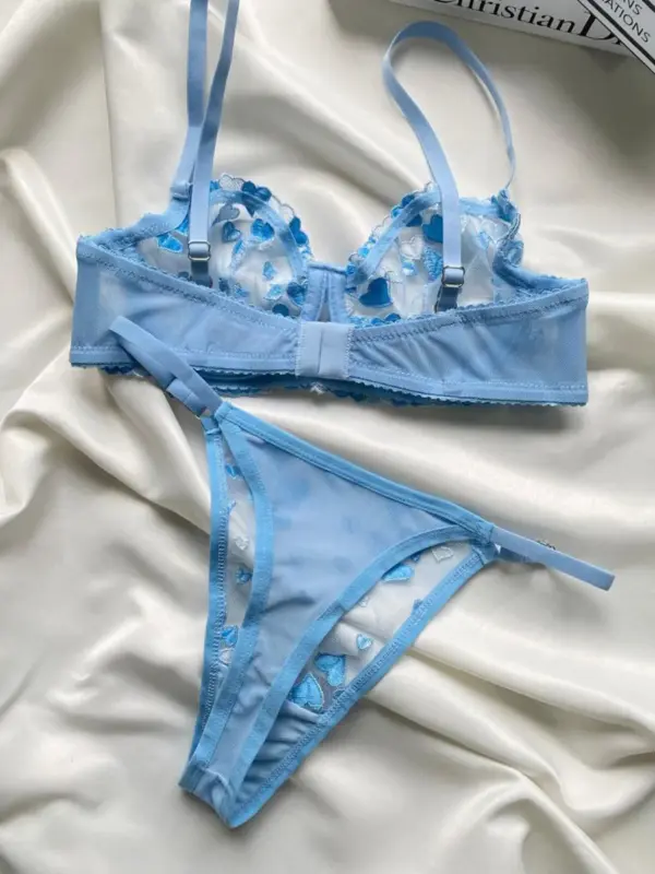Dvodjelni lingerie set u kombinaciji mrežice i veza s podesivim naramenicama na gornjem dijelu i podesivom širinom u struku. Upute za održavanje: pranje na 30°C ili ručno, ne sušiti u sušilici, ne peglati.