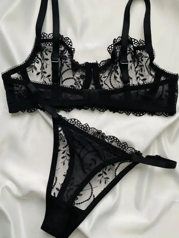 Dvodjelni lingerie set u kombinaciji mrežice i veza s podesivim naramenicama na gornjem dijelu i podesivom širinom u struku. Upute za održavanje: pranje na 30°C ili ručno, ne sušiti u sušilici, ne peglati.