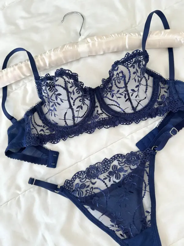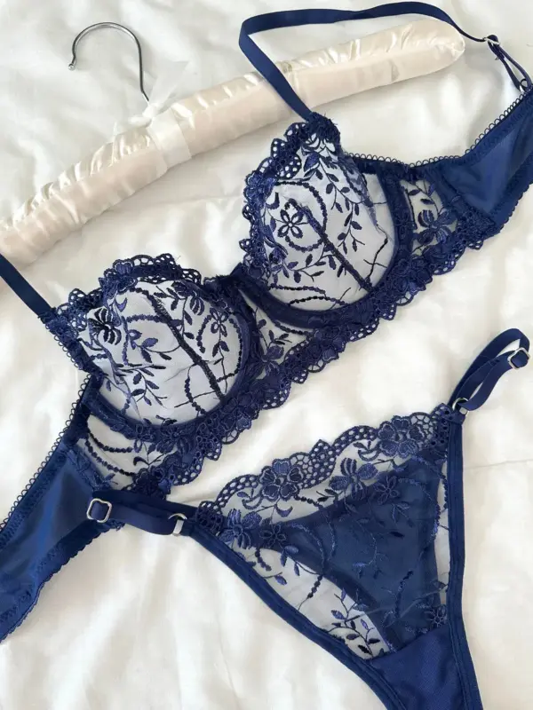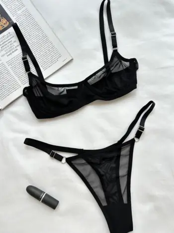 Dvodjelni lingerie set u kombinaciji mrežice i veza s podesivim naramenicama na gornjem dijelu i podesivom širinom u struku. Upute za održavanje: pranje na 30°C ili ručno, ne sušiti u sušilici, ne peglati.