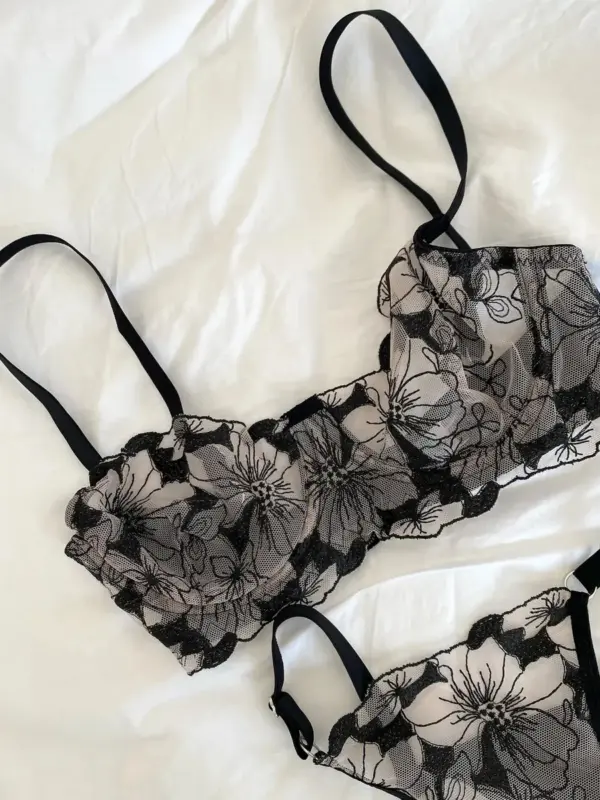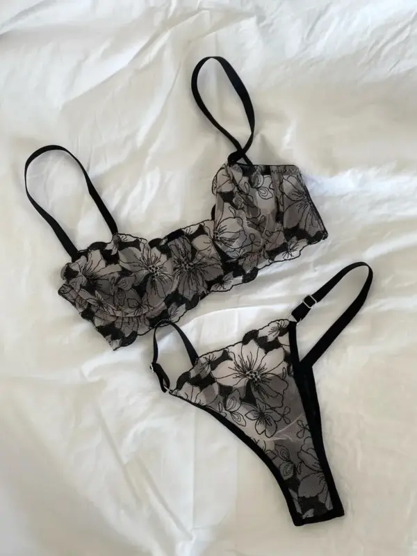Dvodjelni lingerie set u kombinaciji mrežice i veza s podesivim naramenicama na gornjem dijelu i podesivom širinom u struku. Upute za održavanje: pranje na 30°C ili ručno, ne sušiti u sušilici, ne peglati.