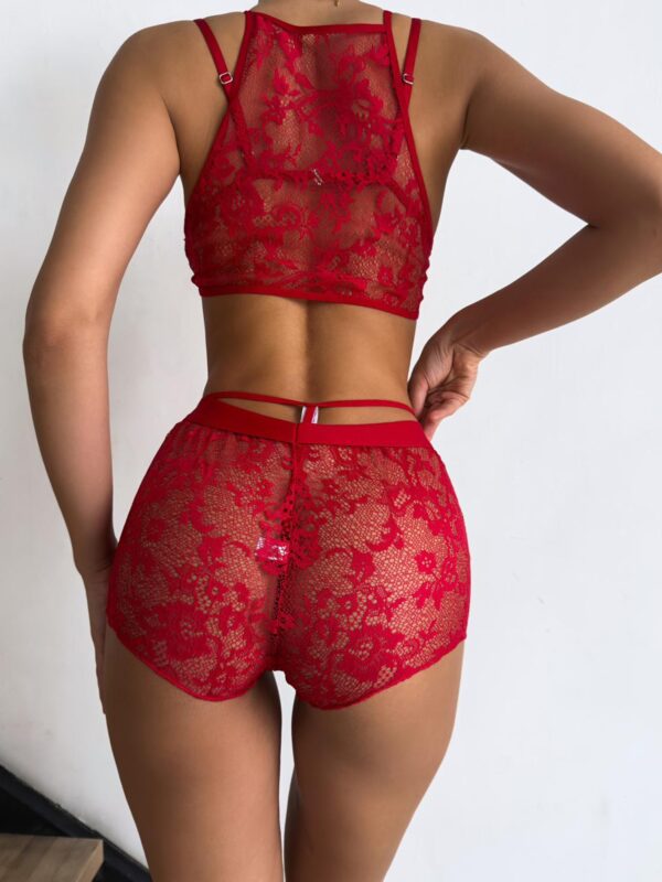 Lingerie set u kombinaciji mrežice i veza s podesivim naramenicama na gornjem dijelu i podesivom širinom u struku. Upute za održavanje: pranje na 30°C ili ručno, ne sušiti u sušilici, ne peglati.