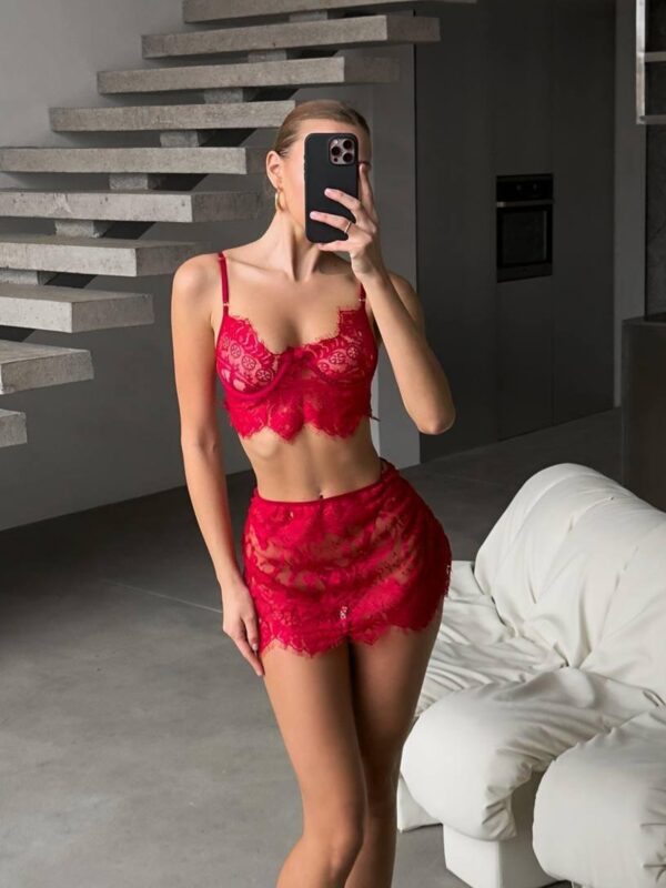 Lingerie set u kombinaciji mrežice i veza s podesivim naramenicama na gornjem dijelu i podesivom širinom u struku. Upute za održavanje: pranje na 30°C ili ručno, ne sušiti u sušilici, ne peglati.