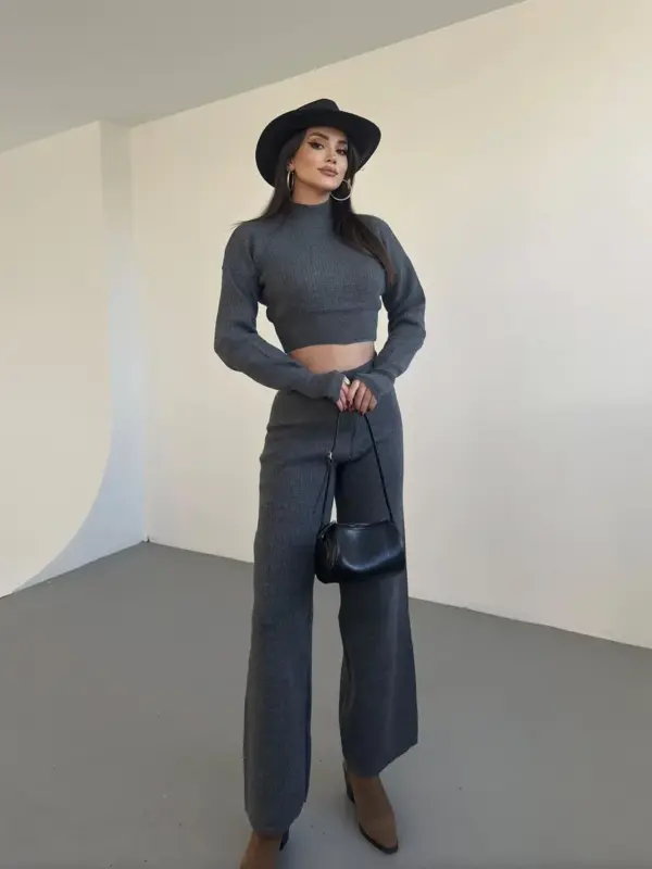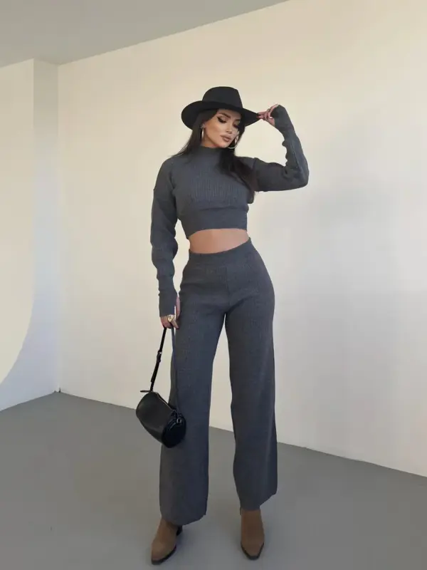 Dodajte stil i udobnost svom ormaru s ovim dvodjelnim pletenim setom od rebraste tkanine. Set je dizajniran tako da kombinuje eleganciju i praktičnost. Gornji dio je crop dužine sa modernim okovratnikom, dok se donji dio širi prema dnu, naglašavajući ženstvenost i pružajući dodatnu udobnost.
