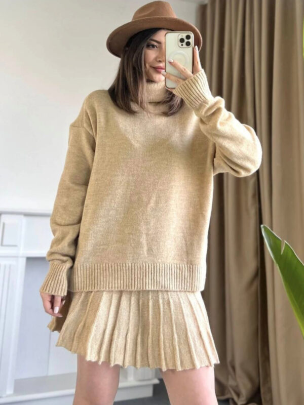 Ovaj triko pleteni set s udobnim džemperom i plisiranom suknjom spaja stil i funkcionalnost za hladnije dane. Džemper s ovratnikom pruža dodatnu toplinu , dok plisirana suknja donosi ženstvenu lepršavost. Izrađen od mekanog materijala, ovaj set osigurava udobnost i lako se kombinira s različitim stilovima – bilo uz čizme za casual varijantu ili potpetice za formalniji outfit. Idealan za slojevito oblačenje, ovaj komplet savršeno će upotpuniti svaku garderobu s modernim i praktičnim dizajnom.