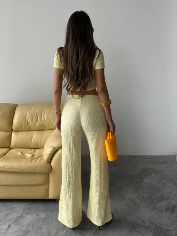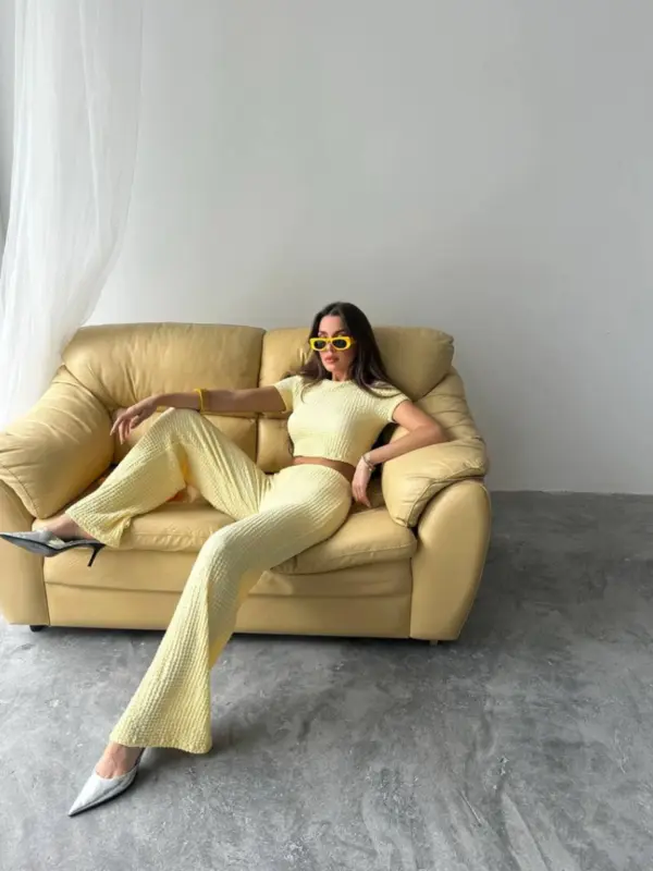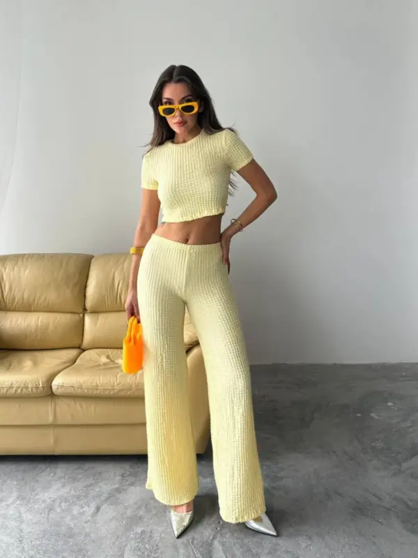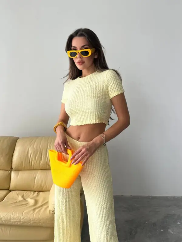 Ovaj udoban dvodijelni set je savršen izbor za ležeran i stylish look! Sastoji se od crop topa kratkih rukava i širokih hlača, oba izrađena od rastezljivog materijala s teksturom.