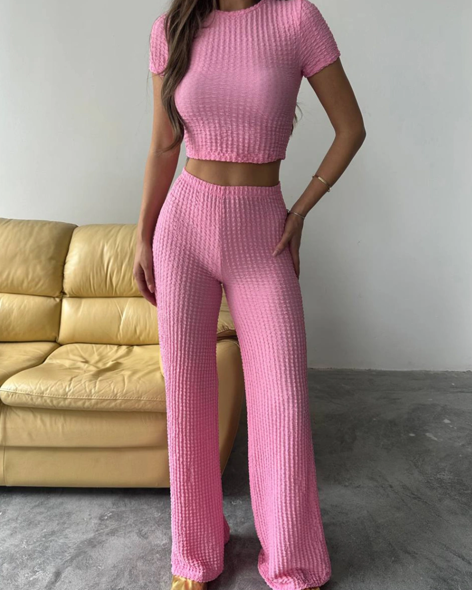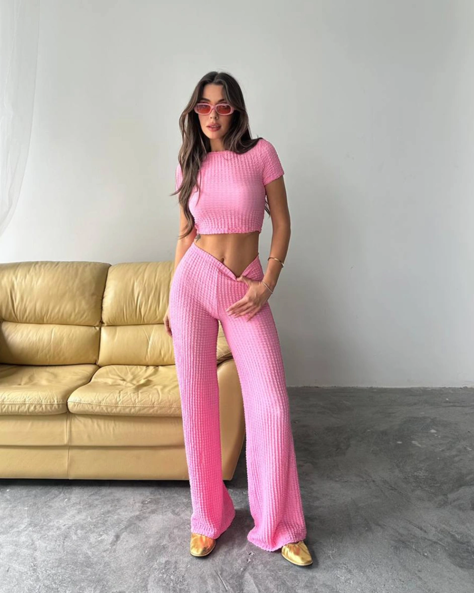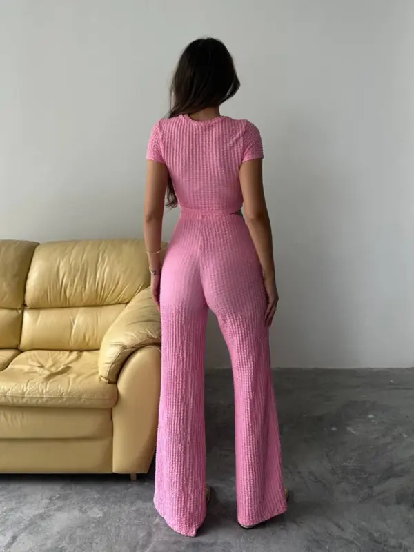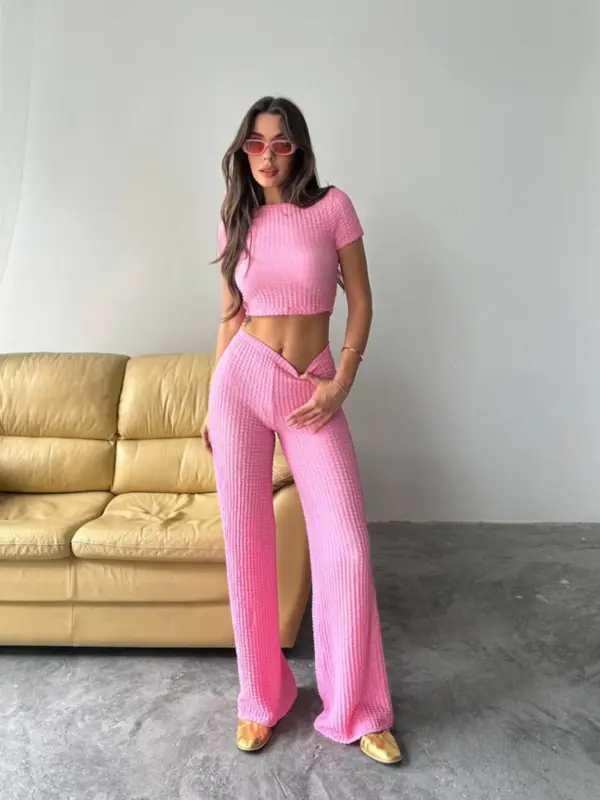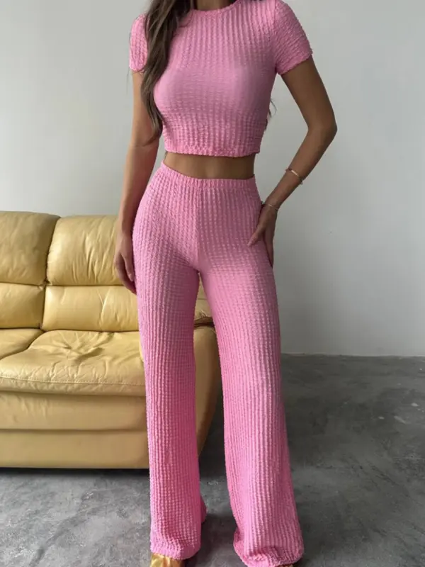Ovaj udoban dvodijelni set je savršen izbor za ležeran i stylish look! Sastoji se od crop topa kratkih rukava i širokih hlača, oba izrađena od rastezljivog materijala s teksturom.