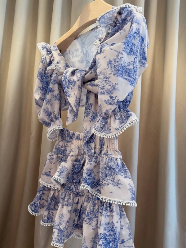 Ovaj ženstveni set sastoji se od kratkog topa s čvorom sprijeda i voluminoznih rukava, te lepršave suknje sa slojevitim volanima. Dekorativni porub u čipkastom stilu dodaje dodatnu dozu šarma i elegancije. Zahvaljujući laganom materijalu i udobnom kroju, set je idealan za ljeto – bilo da ga nosiš u šetnji, na plaži, putovanju ili u večernjem izlasku.
