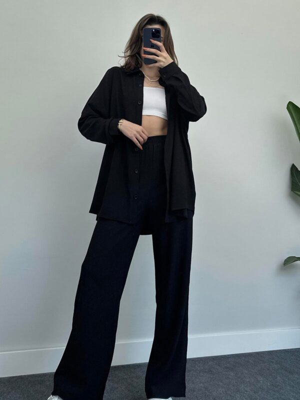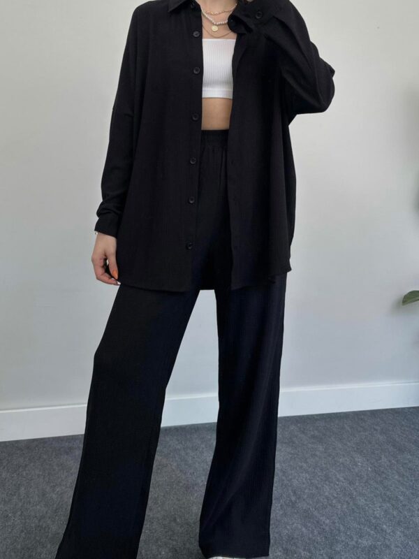 Oversize basic set sa košuljom i šalvarama. Šalvare u struku imaju gumu, ima elastina.