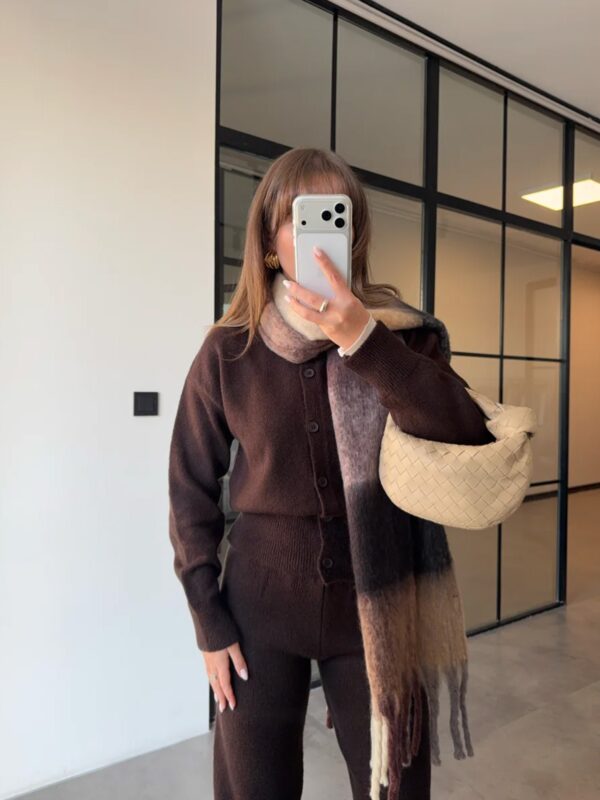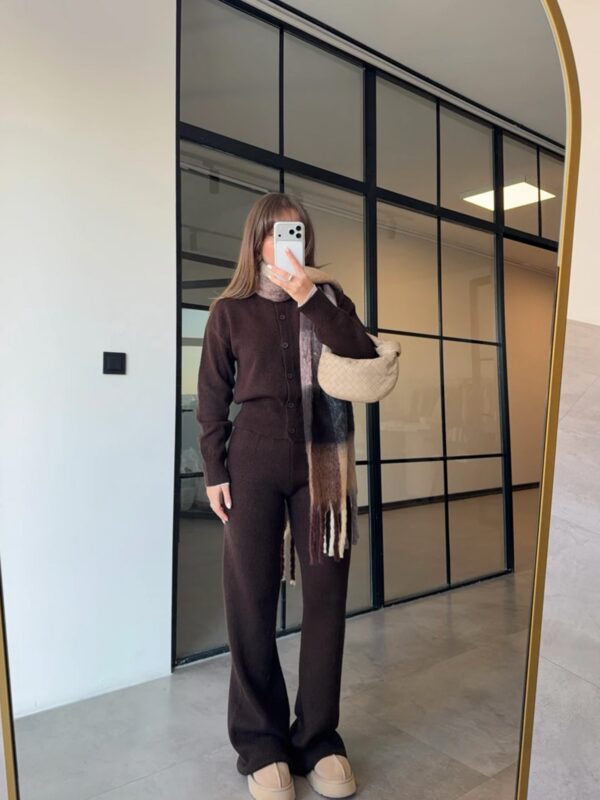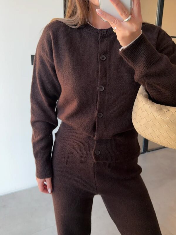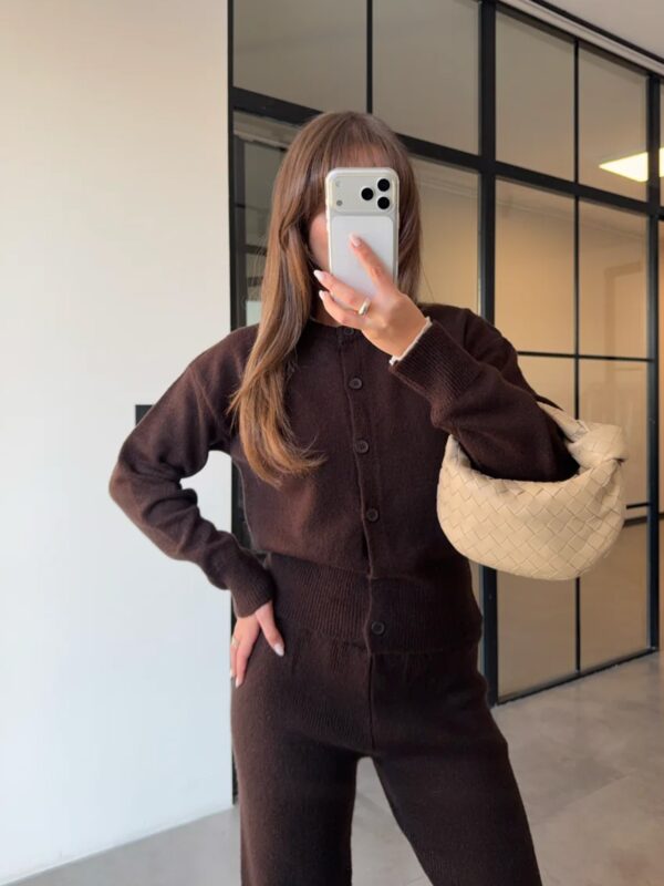 Set se sastoji od klasičnog kardigana na kopčanje i ravnih pletenih pantalona s elastičnom gumom u struku. Kardigan ima okrugli izrez i duge rukave, dok su pantalone jednostavnog, blago šireg kroja koji pruža maksimalnu udobnost i eleganciju.