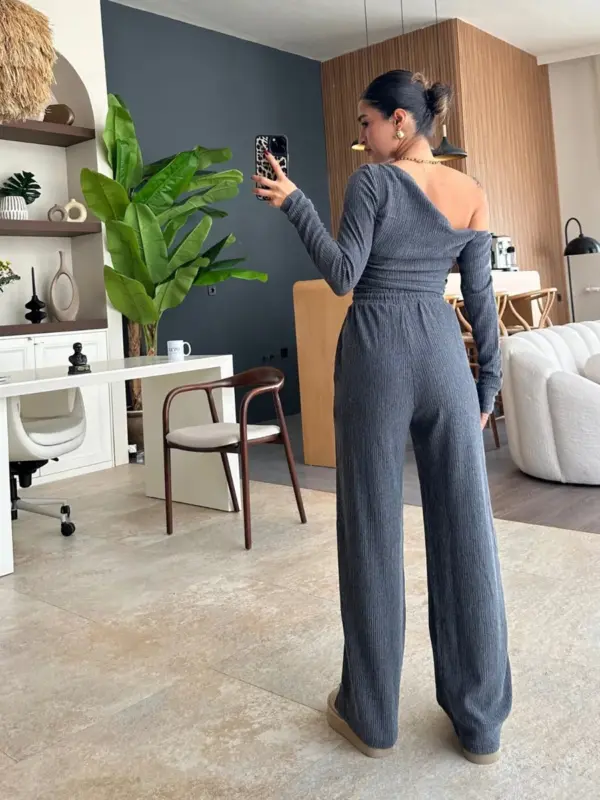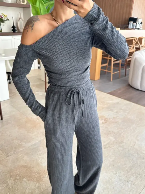 Kad ti treba neΕ‘to ultraudobno, ali i dalje chic β ovaj dvodijelni set je pravi izbor. Rebrasta tkanina pruΕΎa prijatan osjeΔaj na koΕΎi, dok asimetriΔni top s golim ramenom dodaje dozu elegancije i ΕΎenstvenosti.
