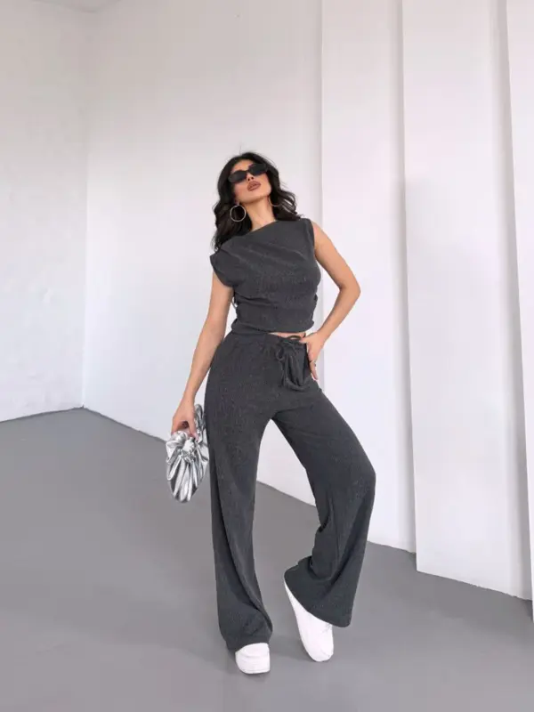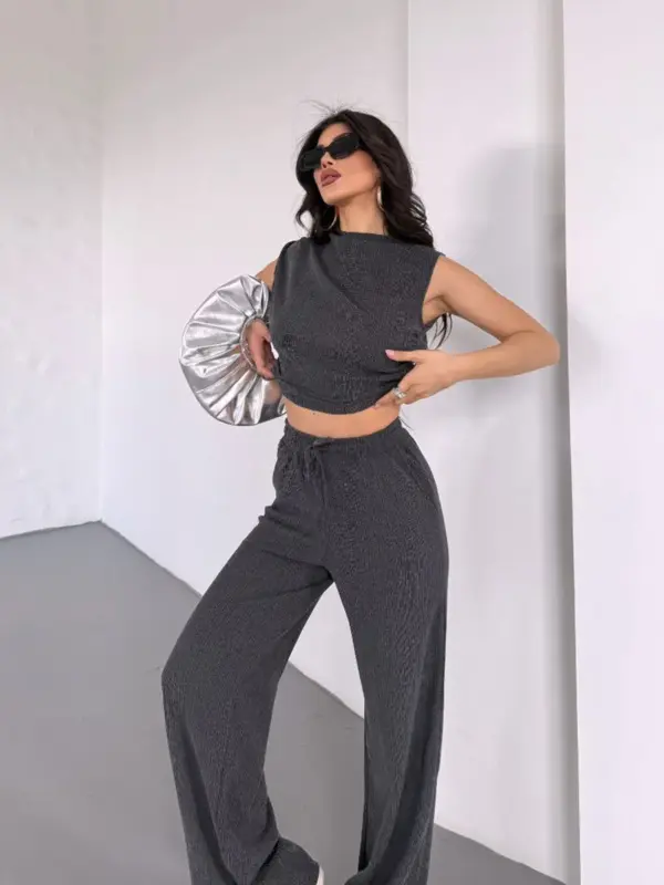 Ovaj udoban dvodijelni set je savršen izbor za ležeran i stylish look! Sastoji se od crop topa bez rukava i širokih hlača, oba izrađena od rebrastog ili teksturiranog materijala.